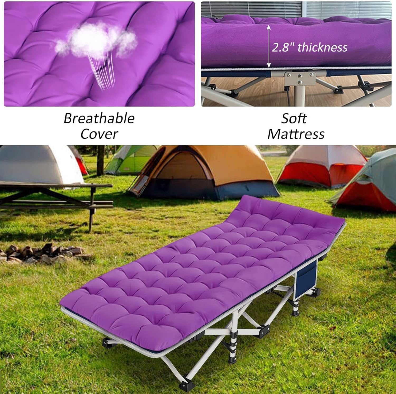 - Camping cot SUIT: Our camping cot contains a cot, a mattress and a carry bag. The cot bed and the mattress are separate. The mattress is fluffy and soft and can be used alone.