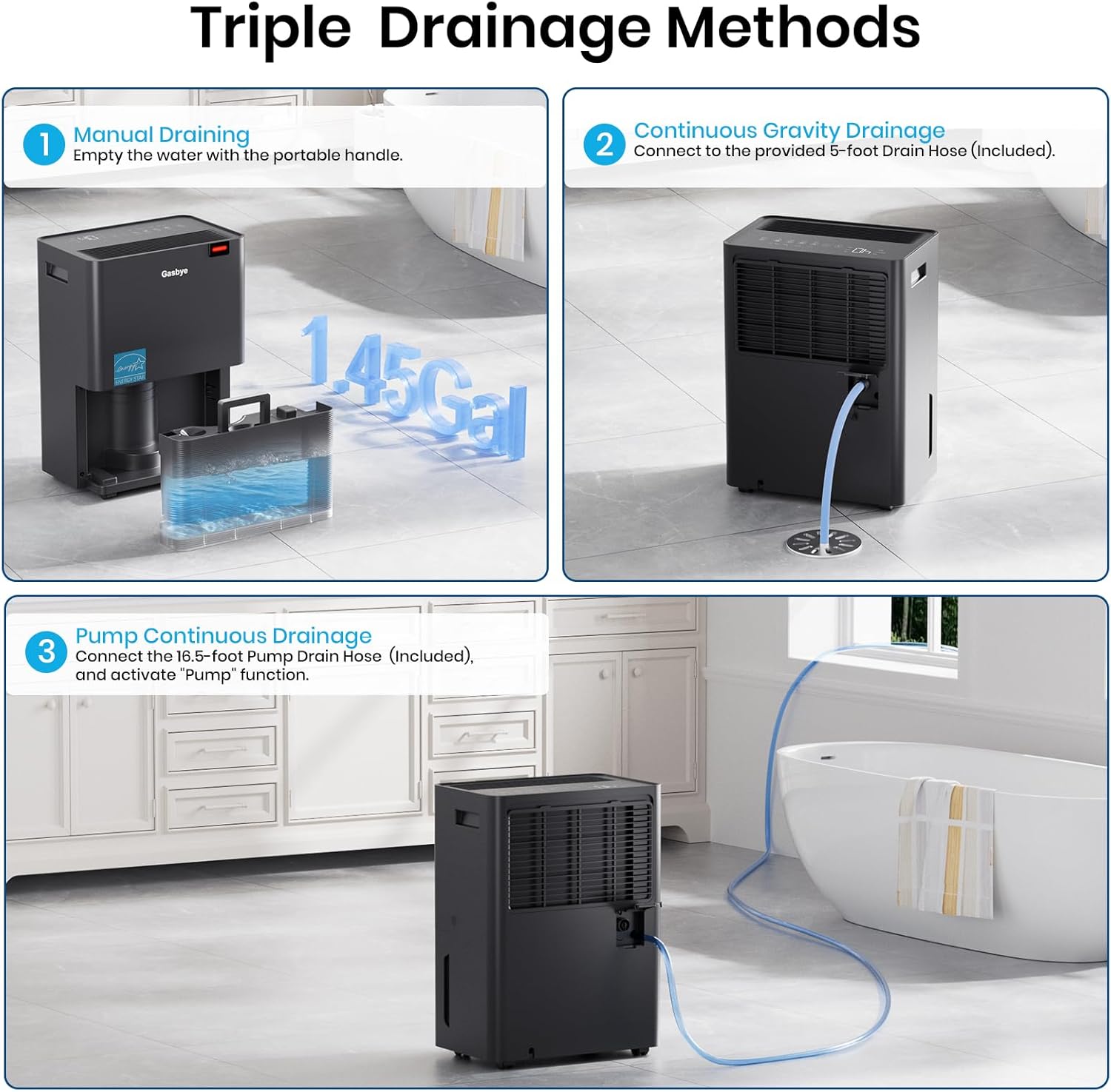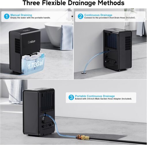 - [Triple Draining Flexibility] Choose from a spacious 1.7Gal tank for manual drainage, an included 5-foot hose for direct connection to floor drains, or an included garden hose adapter for extended disposal with your garden hose
