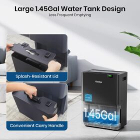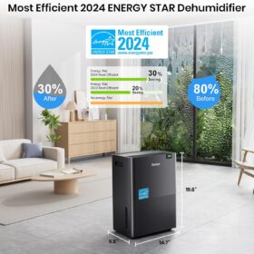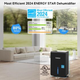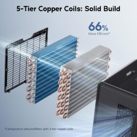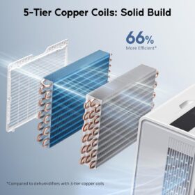 - [43-Pound Solid Build with 5 Rows of Copper Tubing] The Gasbye DryPrime dehumidifier pulls up to 115 pints/day at 86°F, 80% RH, 73 pints/day at 80°F, 60% RH, and 50 pints/day at 65°F, 60% RH. Since we don’t inflate the pints/day performance figures, what you see is what you get. Dimensions: 11″ D × 15″ W × 24″ H, which may be larger compared to some other “mini” models with inflated pints/day ratings