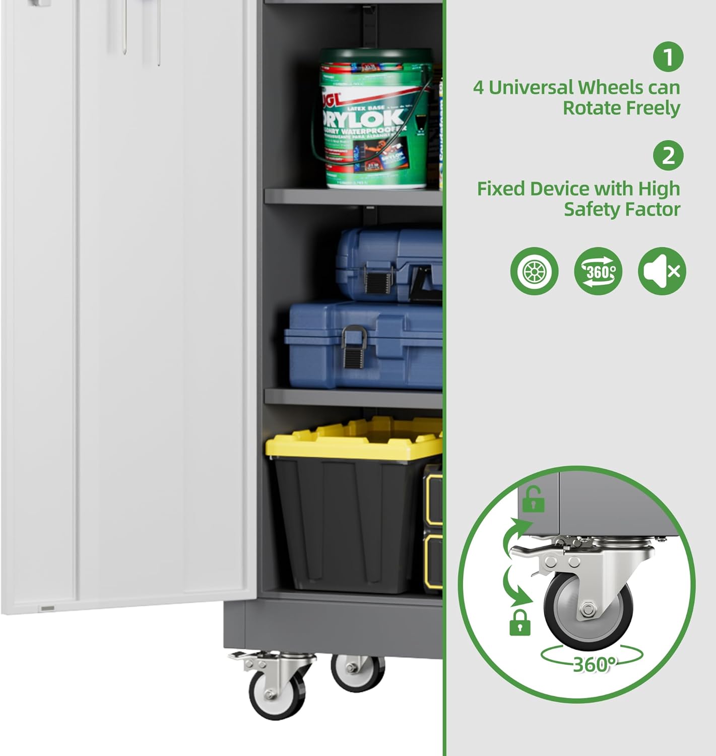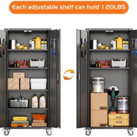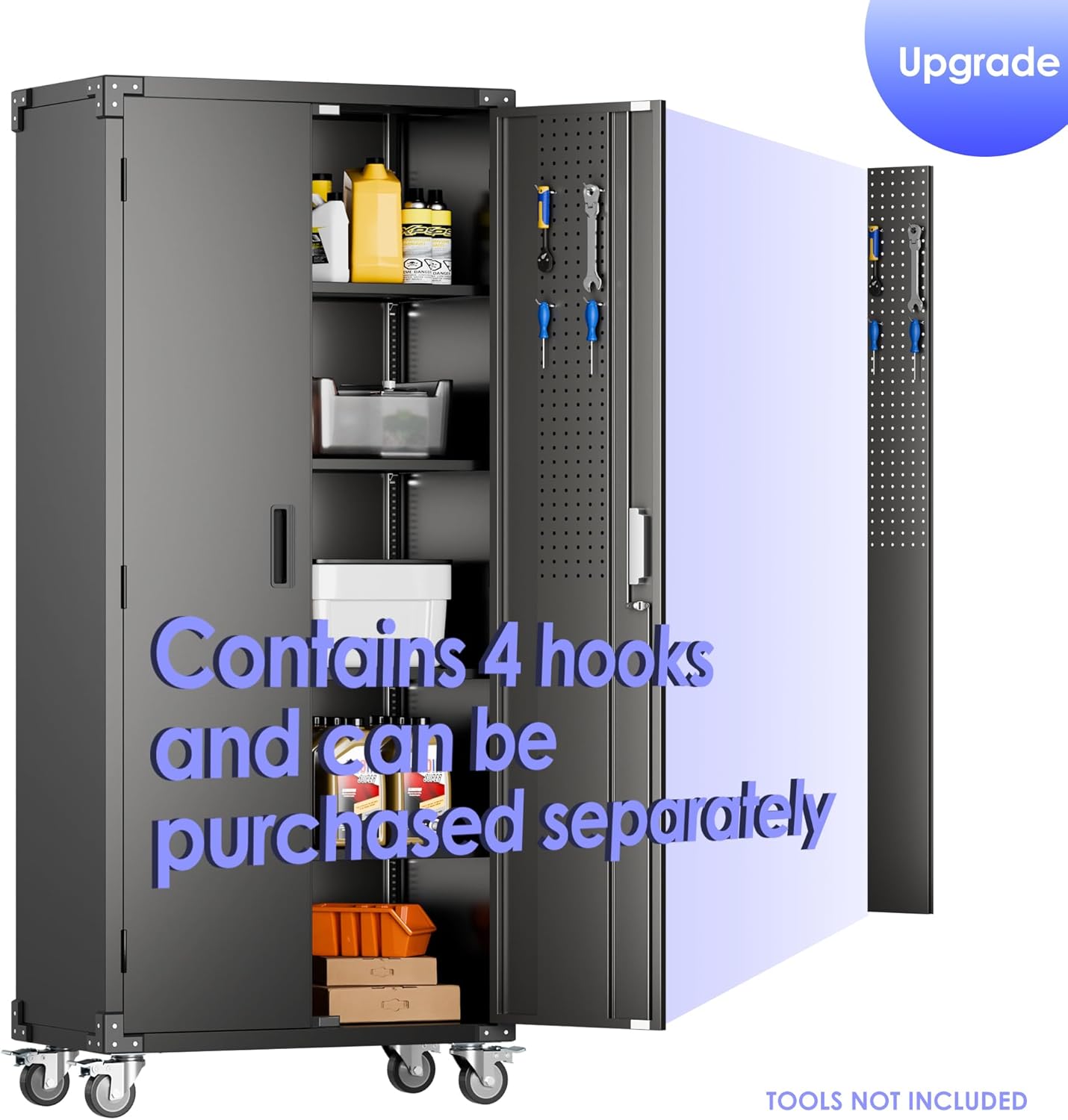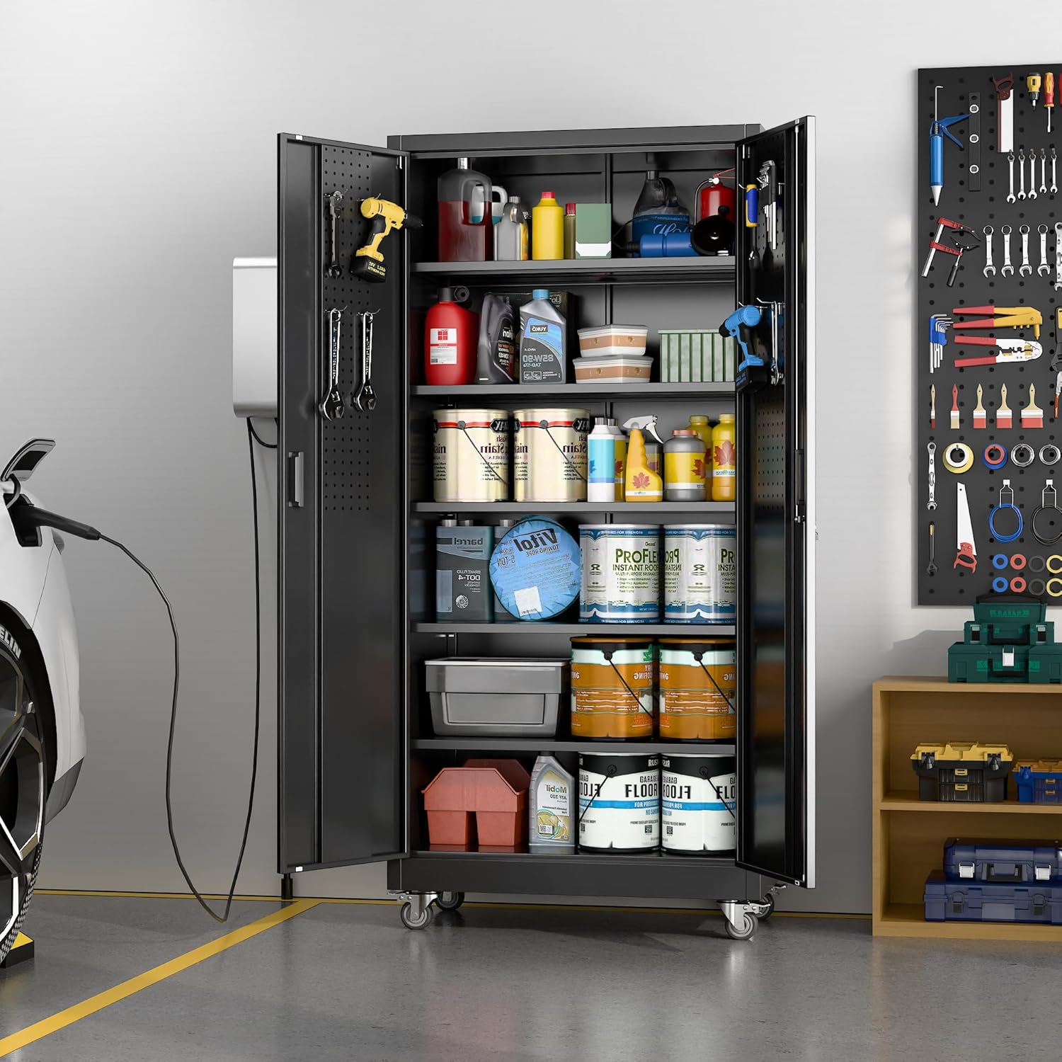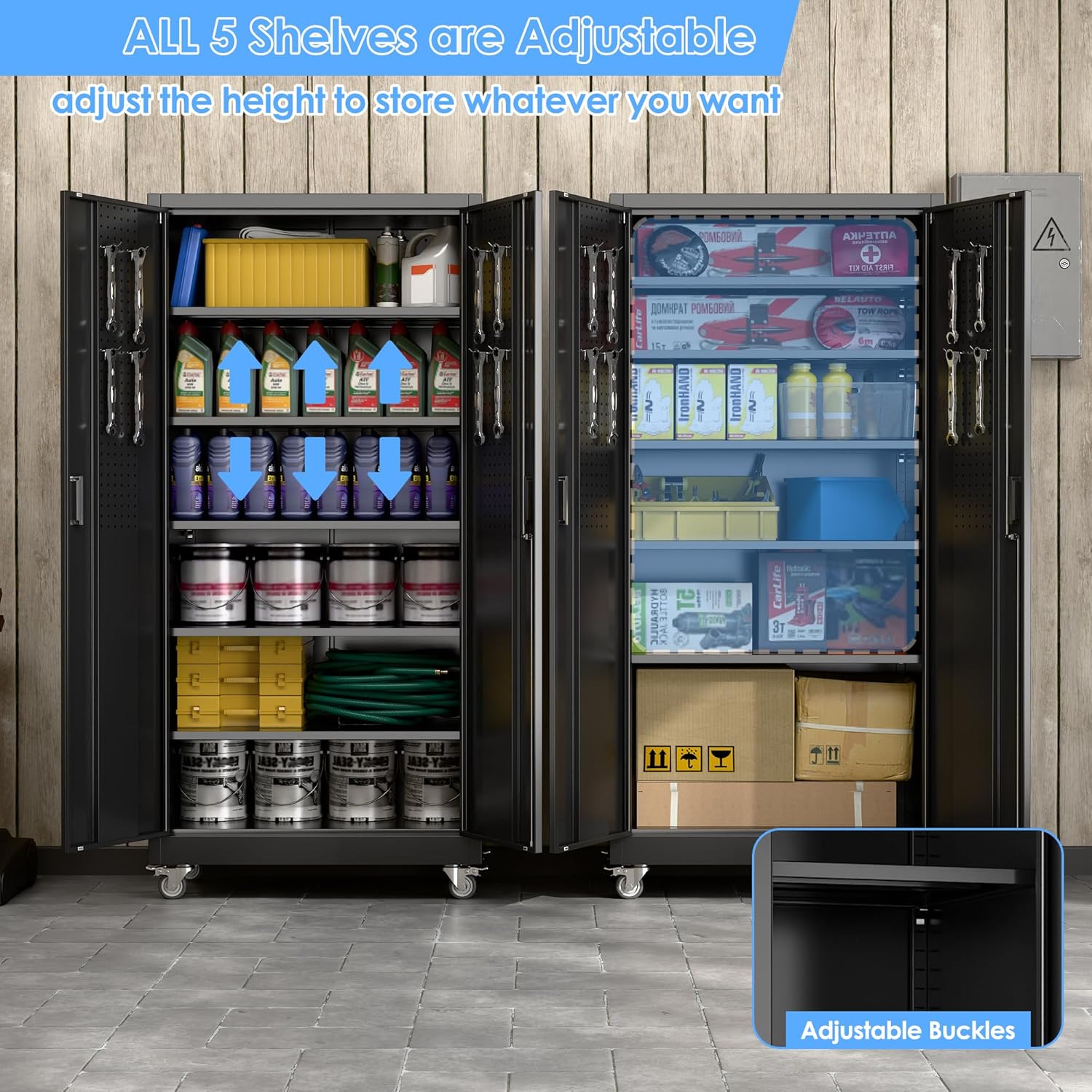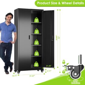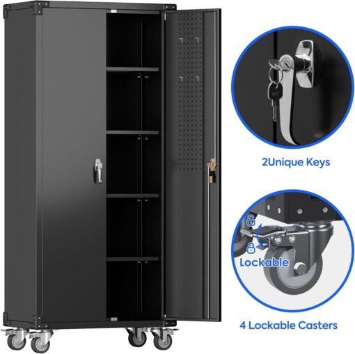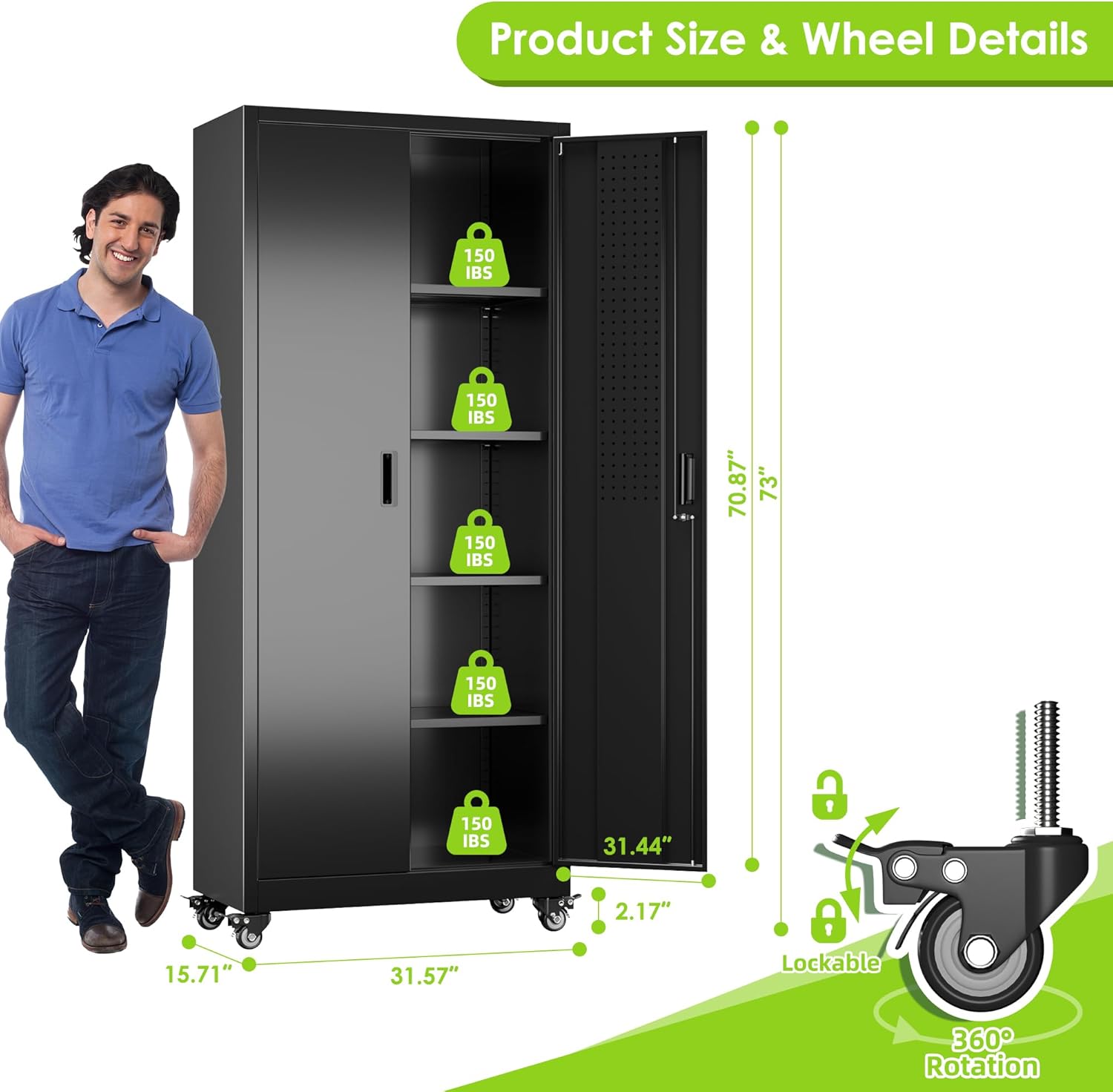 Aobabo 73”H Metal Garage Storage Cabinet with Wheels,Steel Cabinets with 2 Doors and 4 Adjustable Shelves for Home Office,Required Assembly,Black