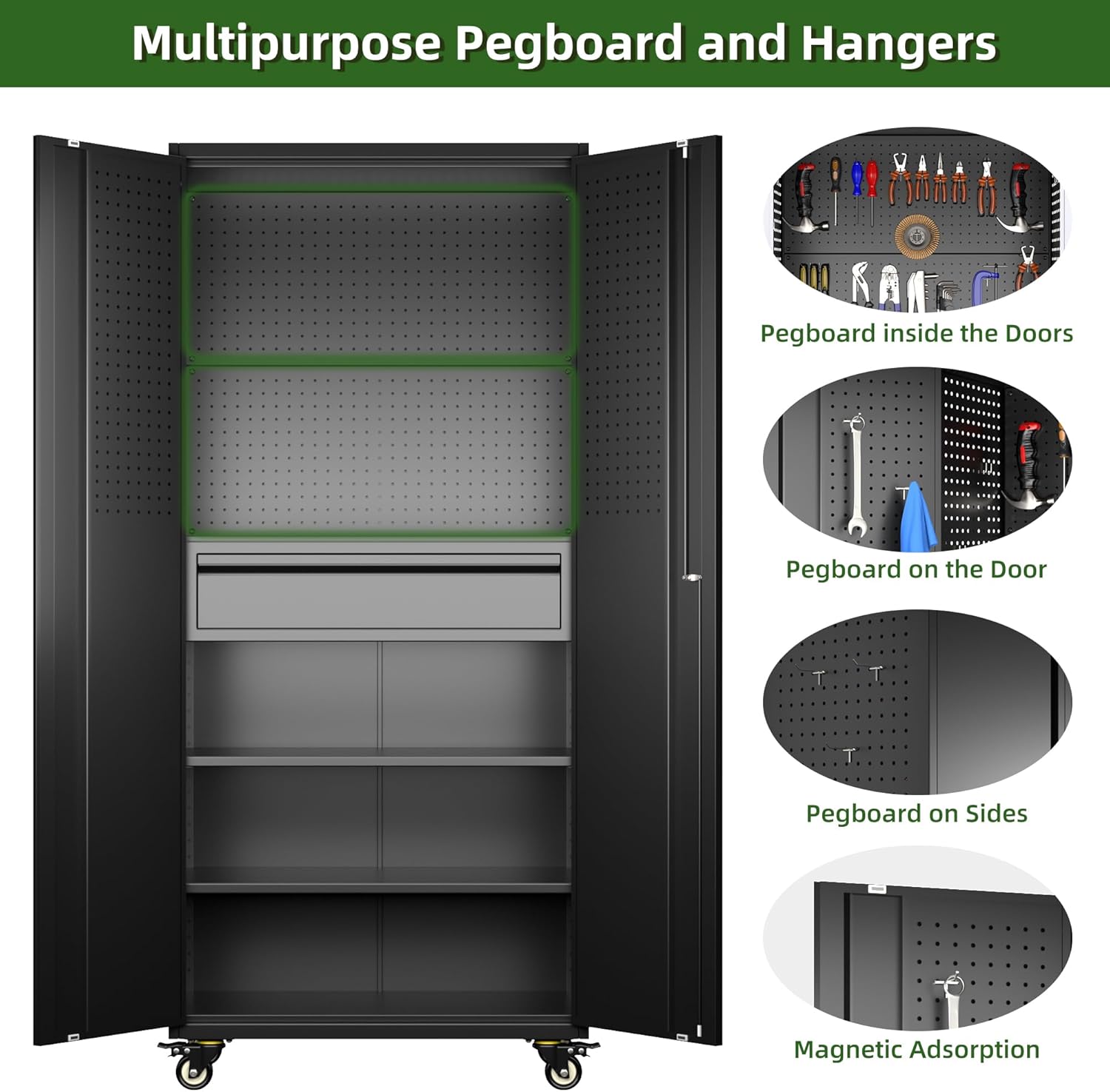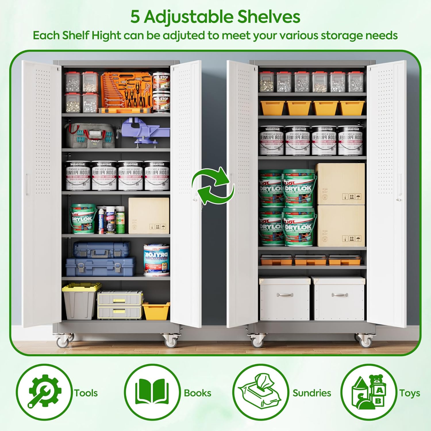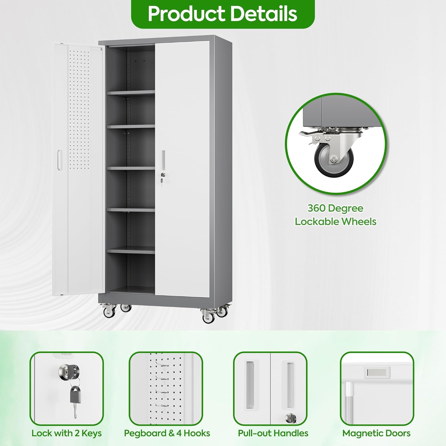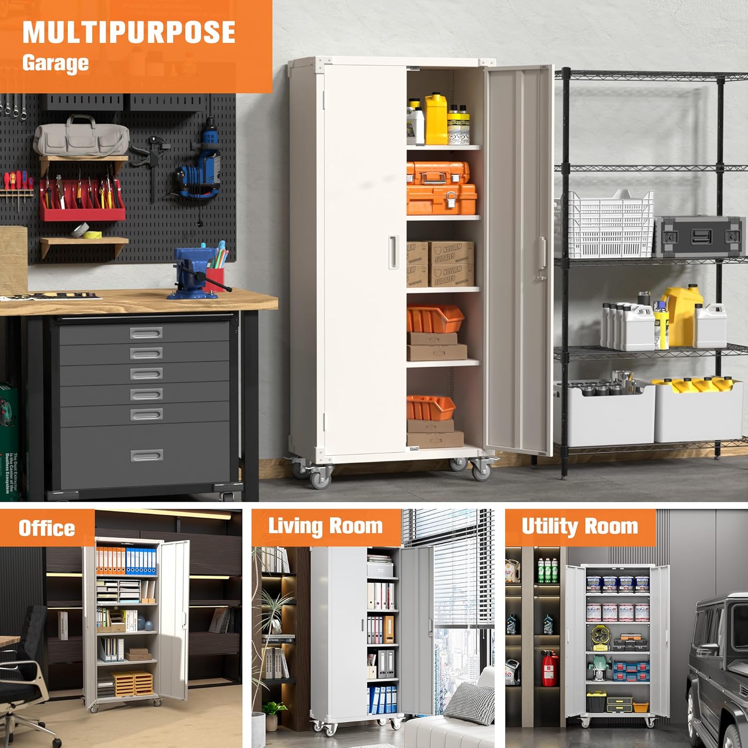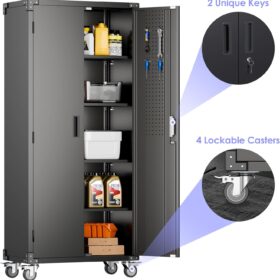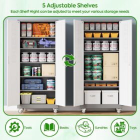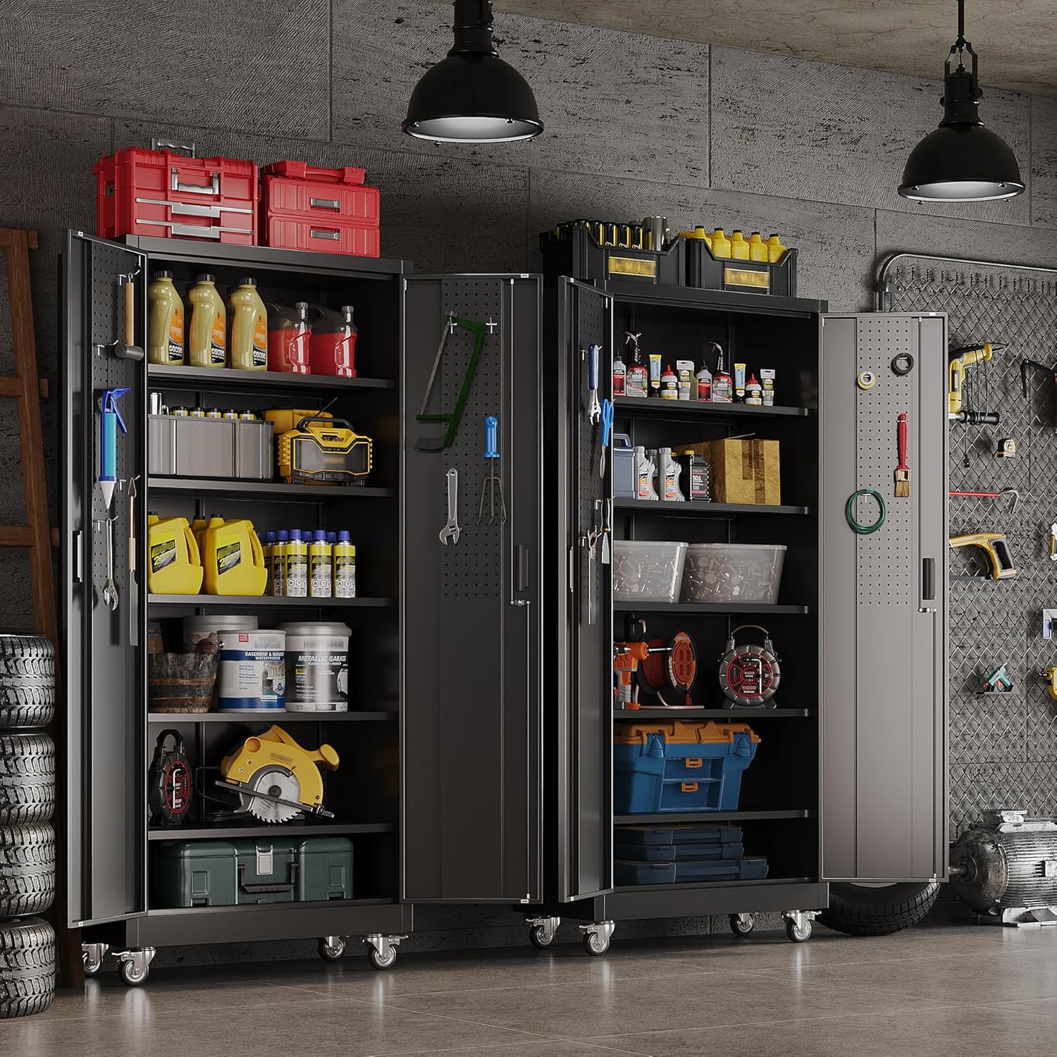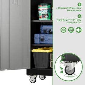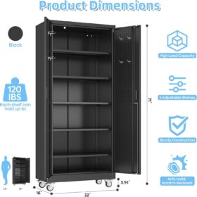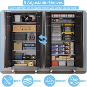 Aobabo 73”H Metal Garage Storage Cabinet with Wheels,Steel Cabinets with 2 Doors and 4 Adjustable Shelves for Home Office,Required Assembly,Black