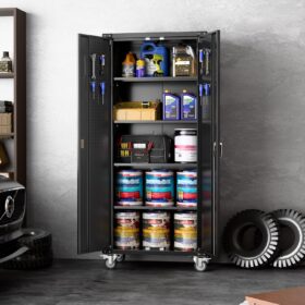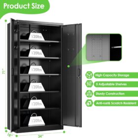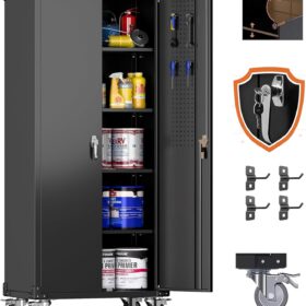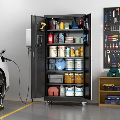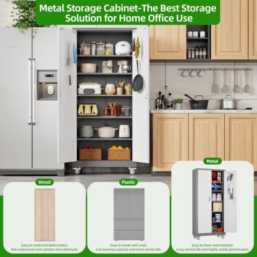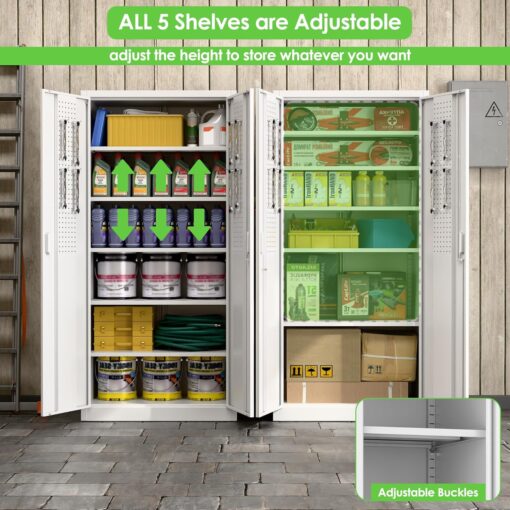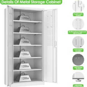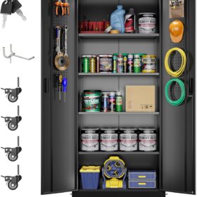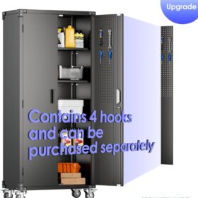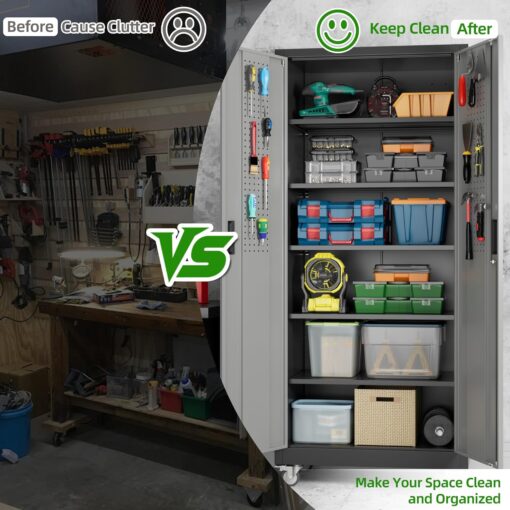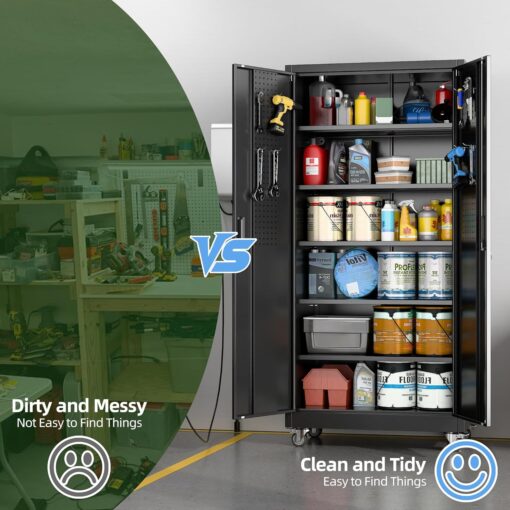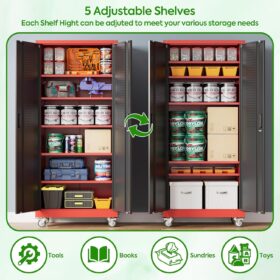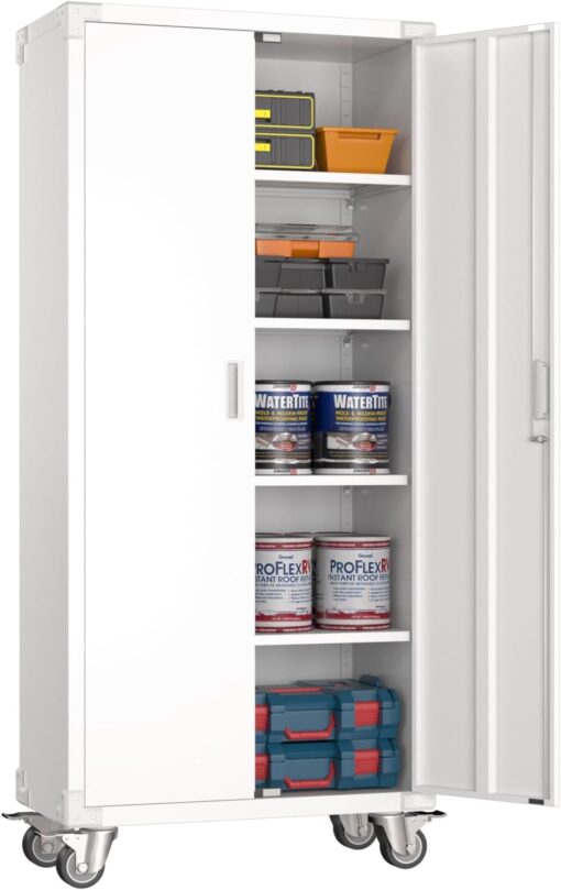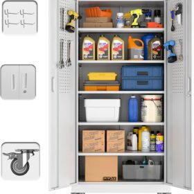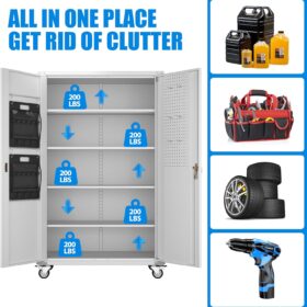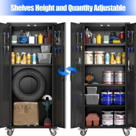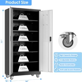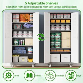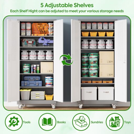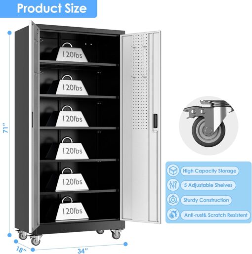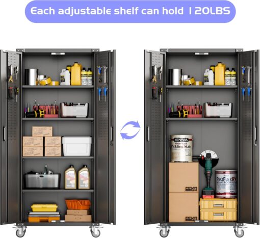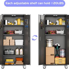 - [Adjustable Shelves&Large Weight Capacity] The metal storage cabinet with wheels has 5 adjustable and removable shelves, which can offer you flexible space. Each shelf of the storage cabinet on wheels can hold up to 120lbs. you can add lighting by yourself on top of the cabinet if it was dark where you keep it.