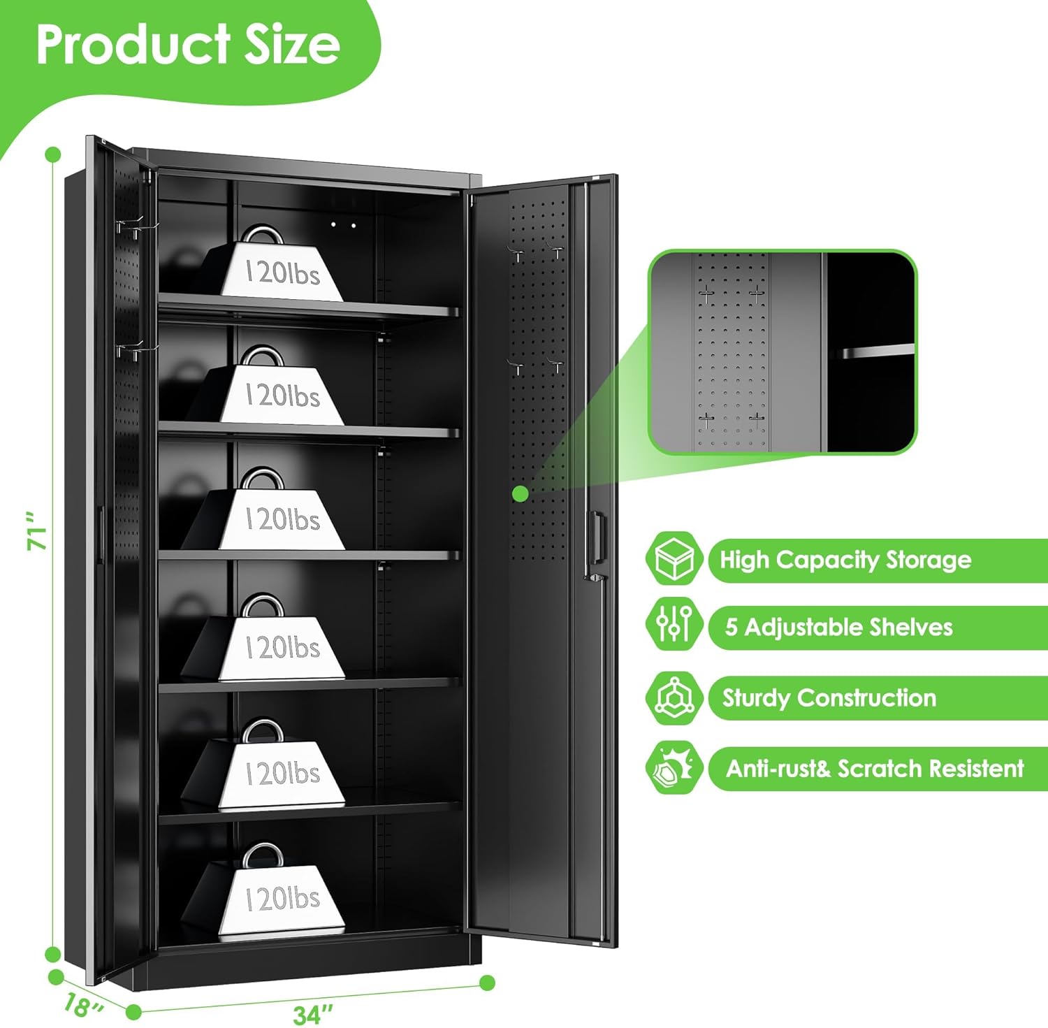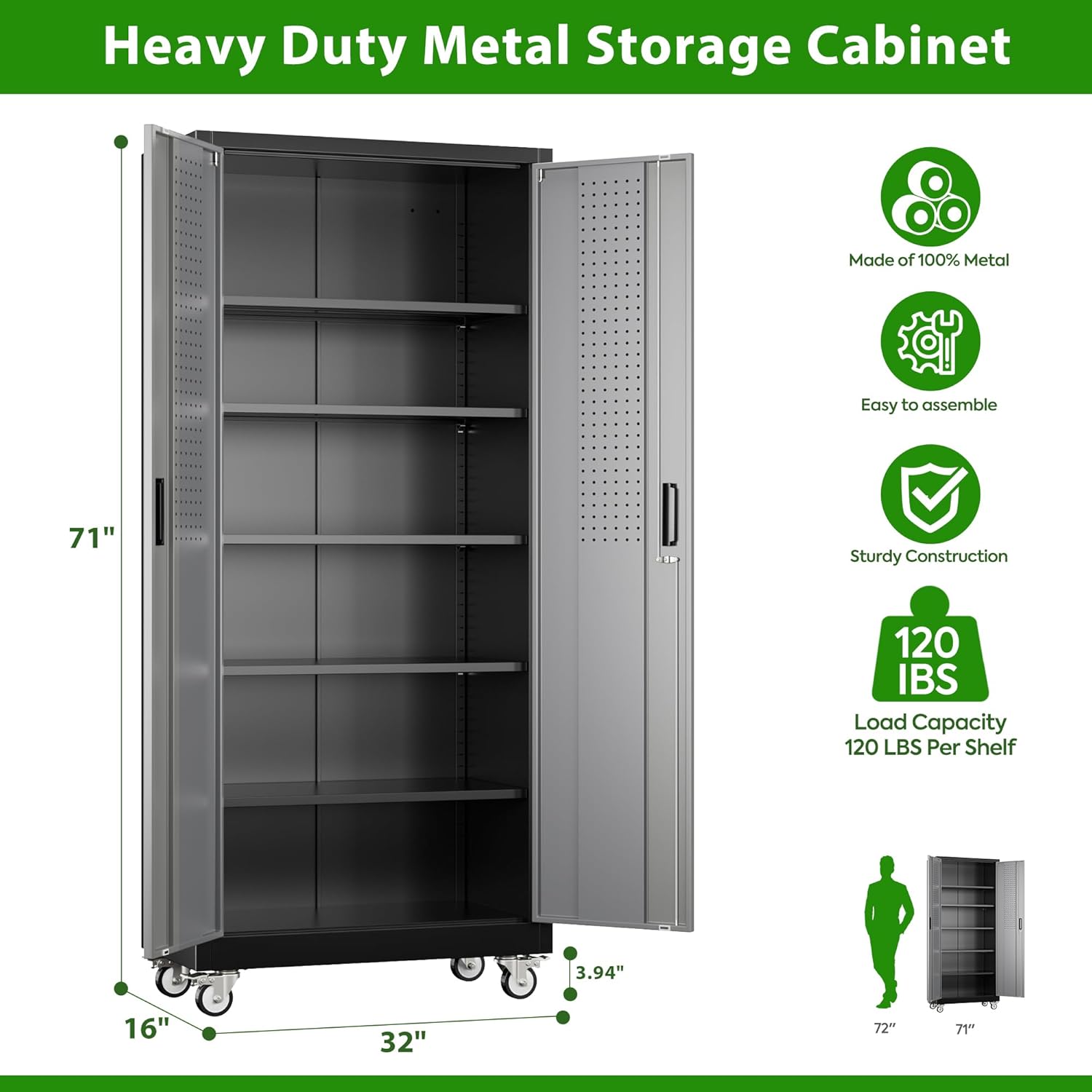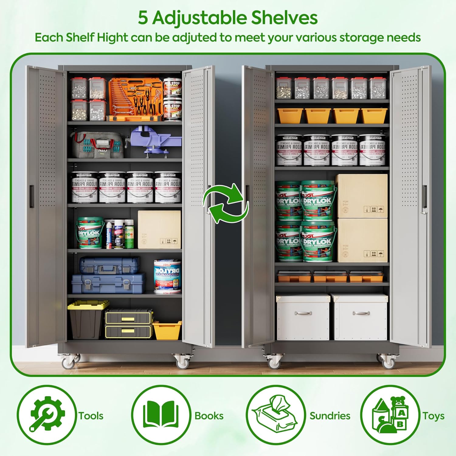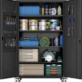 - [Adjustable Shelves&Large Weight Capacity] The metal storage cabinet with wheels has 5 adjustable and removable shelves, which can offer you flexible space. Each shelf of the storage cabinet on wheels can hold up to 120lbs. you can add lighting by yourself on top of the cabinet if it was dark where you keep it.