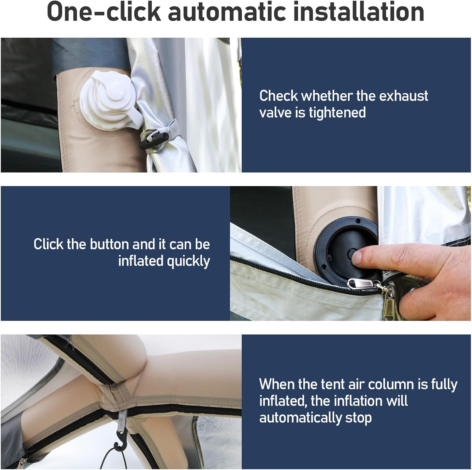 - 【Quick Setup in 2 Minutes】This portable inflatable tent features a one-piece inflatable pole design with high-temperature heat-sealed seams. It features a Built-in air pump that inflates quickly with a pressure-limiting valve for safety. The guylines and steel stakes help secure the 4-season tent to the ground. Set up is fast and easy, making your camping experience more relaxing.