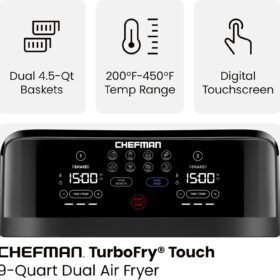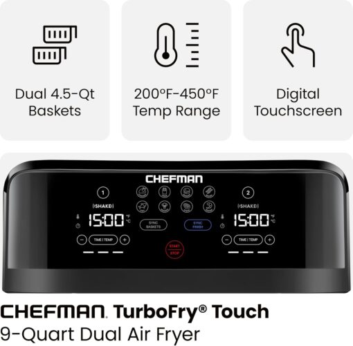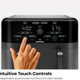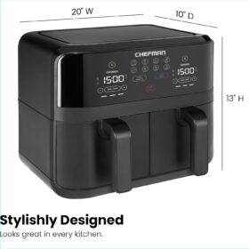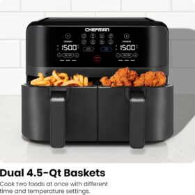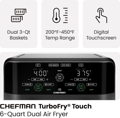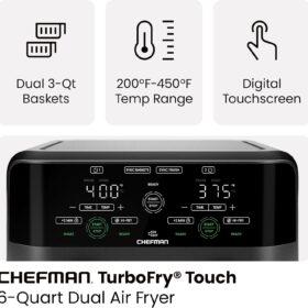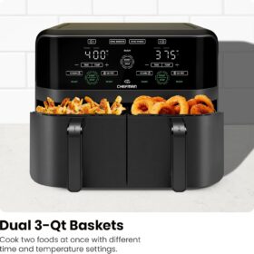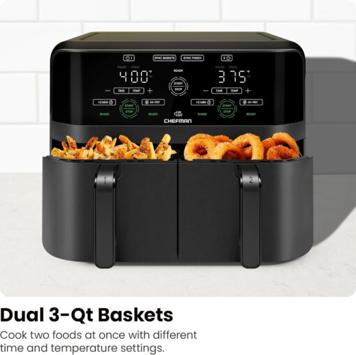- DUAL AIR FRYER WITH 2 BASKETS: Cook food faster and more conveniently with two powerful air fryers in one with a combined 6-quart large air fryer capacity.
