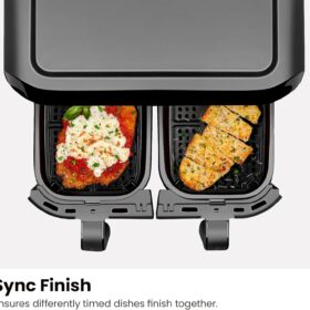 - FOOD FINISHES TOGETHER: Convenient Sync Finish allows individual 3-quart large-capacity air fryer double baskets to finish cooking simultaneously.