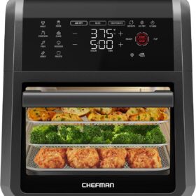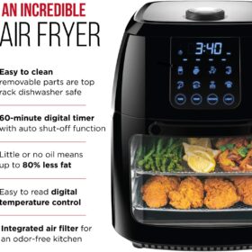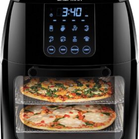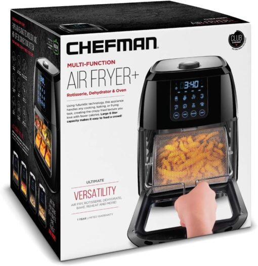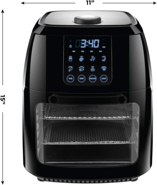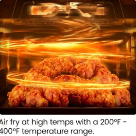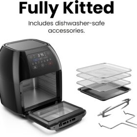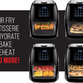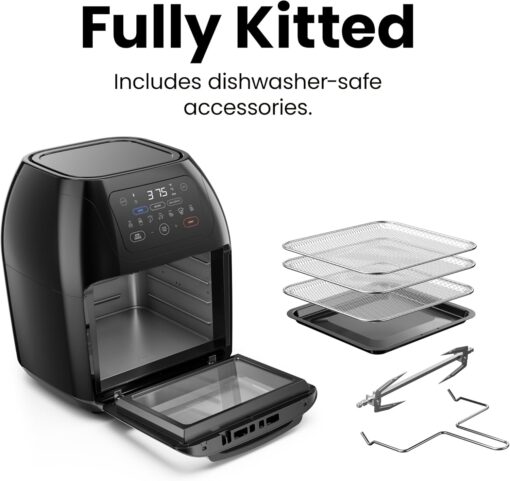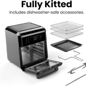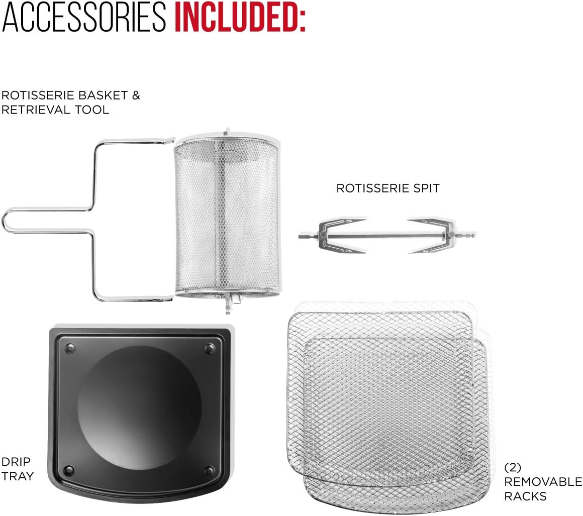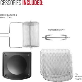 - All-inclusive: Includes three air flow racks, stainless steel rotisserie oven spit with retrieval tool, and a drip tray