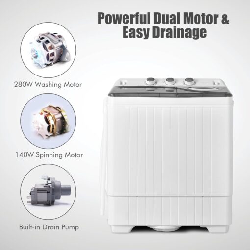 - [Durable Motor] Thanks to the powerful motor, you can wash your clothes quickly and efficiently. It runs quietly without disturbing the neighbors. 280W washing power and 140W spin power ensure continuous output and prolonged durability.