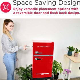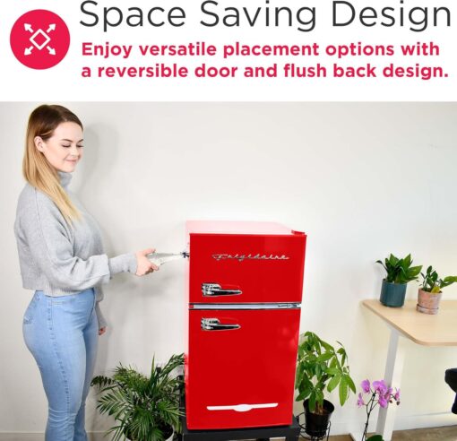 - USER-FRIENDLY DESIGN: The compact fridge is constructed with two pull handles for easy opening and closing, along with a reversible door and flush back design for added flexibility to suit your space.