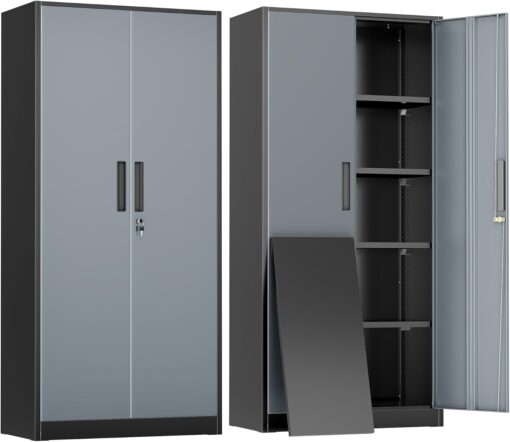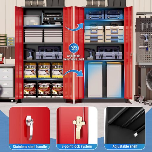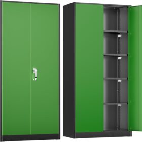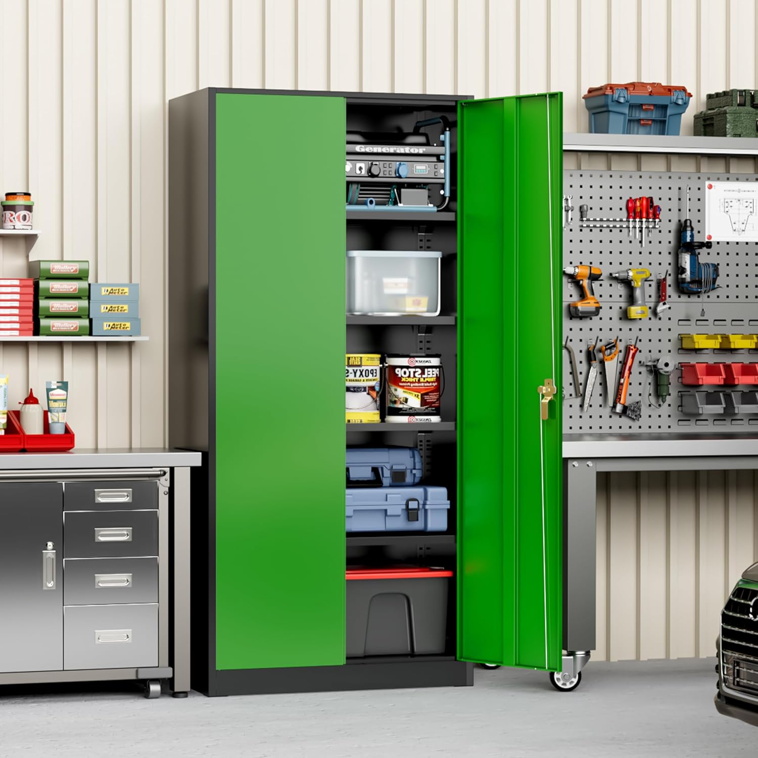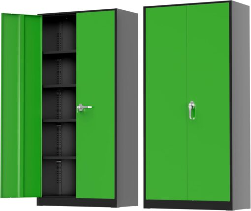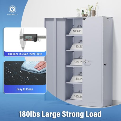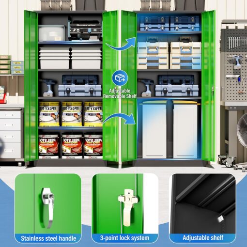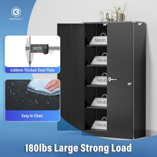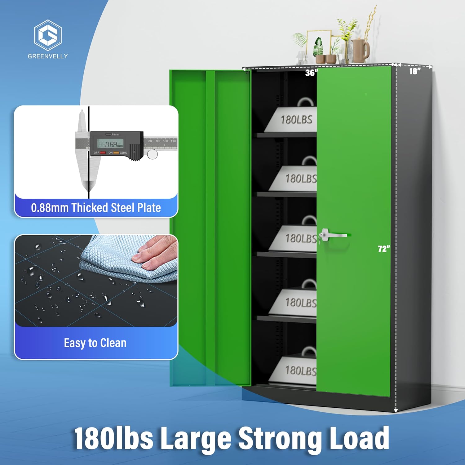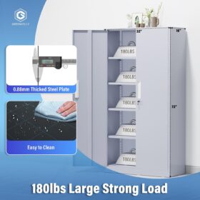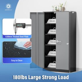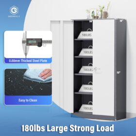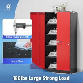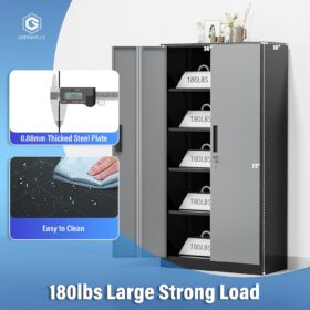 - 【Adjustable Metal Shelves】Greenvelly garage storage cabinet has 4 adjustable metal shelves that can hold up to 180 lbs. each. You can move the height of the shelves to divide the space between the metal cabinet’s tiers. This design provides flexibility to meet your storage space needs.