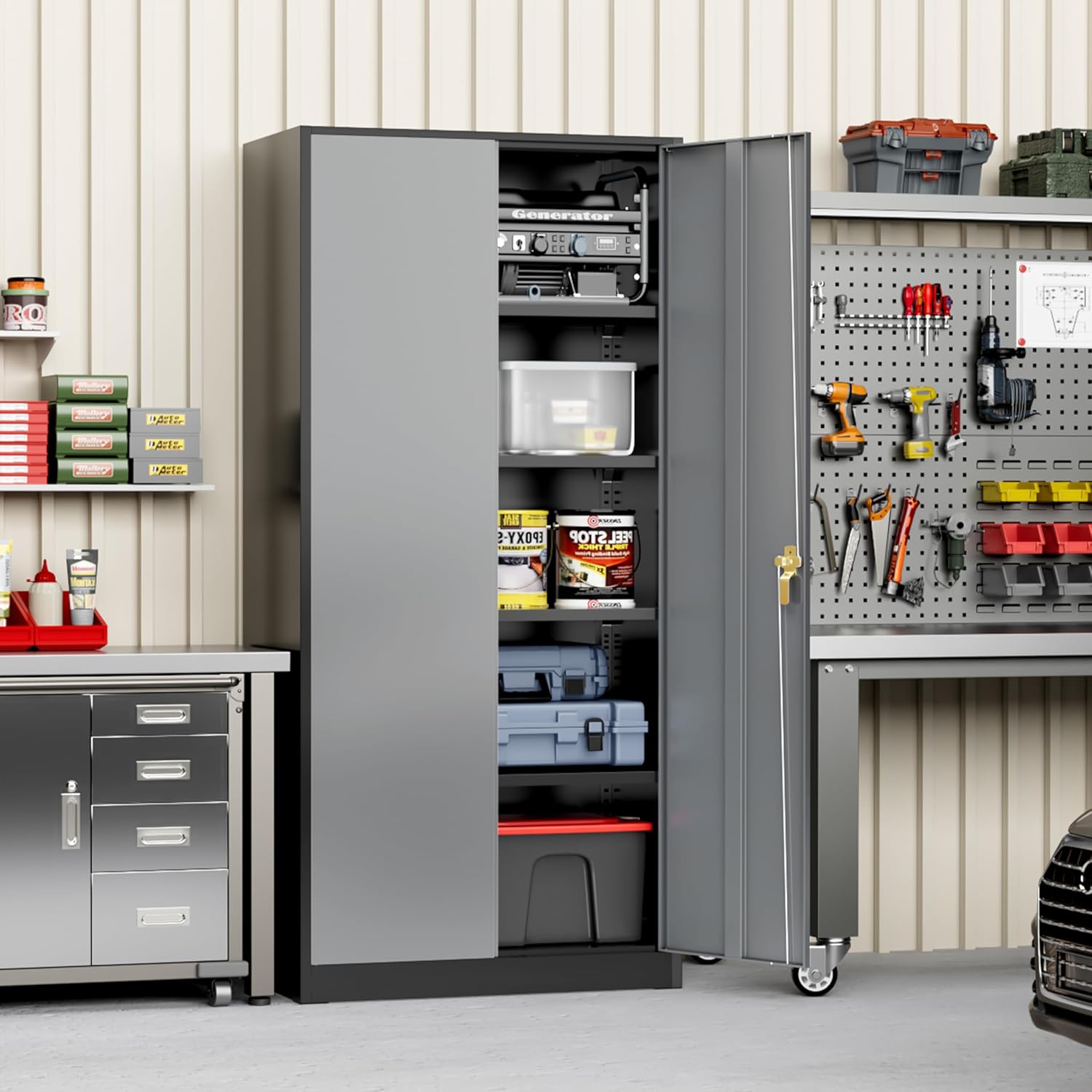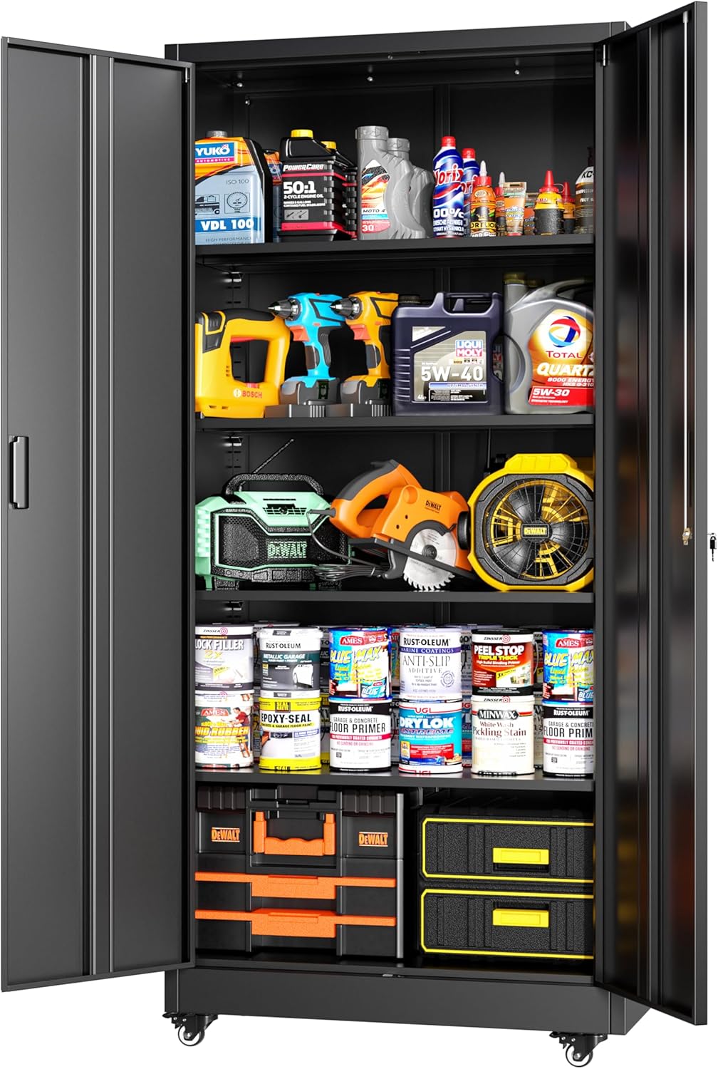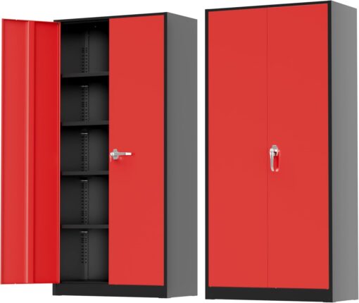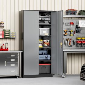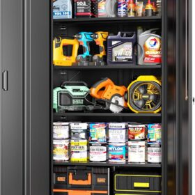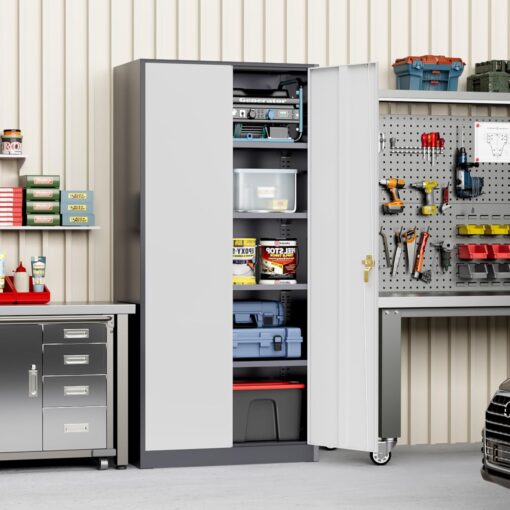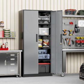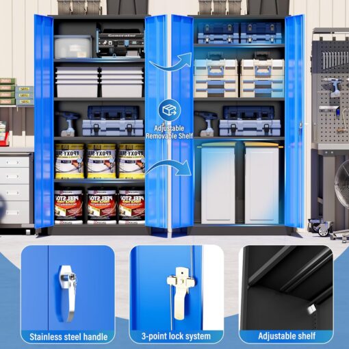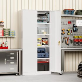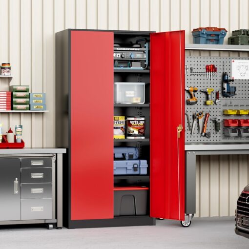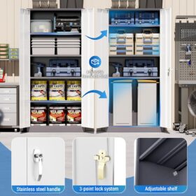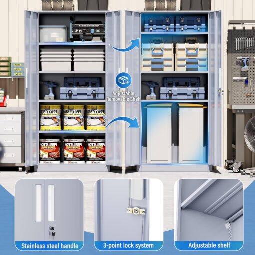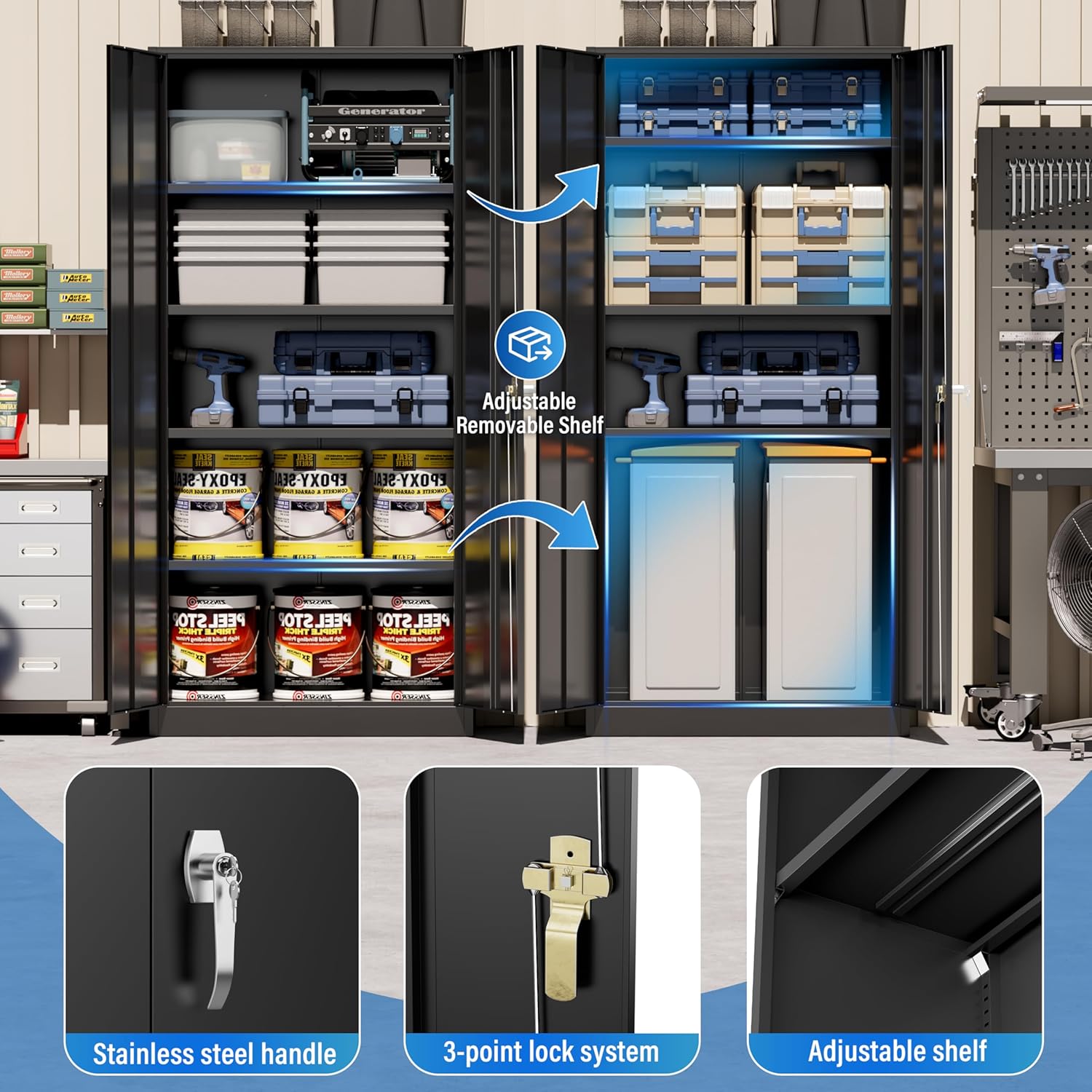 - 【Adjustable Metal Shelves】Greenvelly garage storage cabinet has 4 adjustable metal shelves that can hold up to 180 lbs. each. You can move the height of the shelves to divide the space between the metal cabinet’s tiers. This design provides flexibility to meet your storage space needs.
