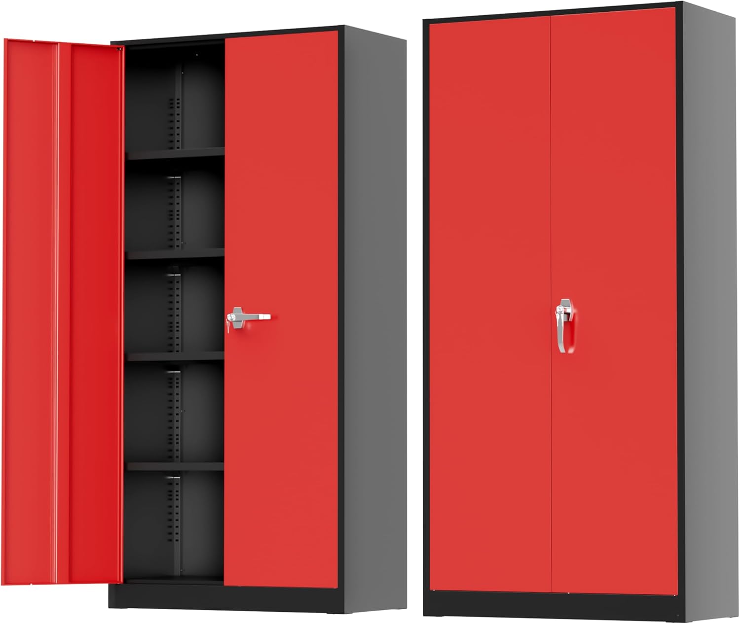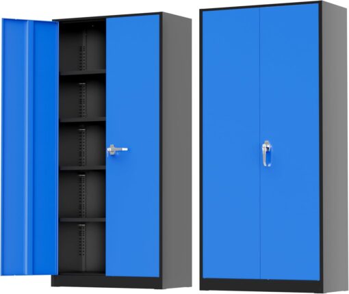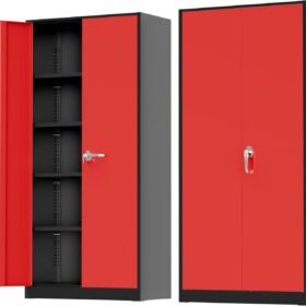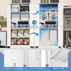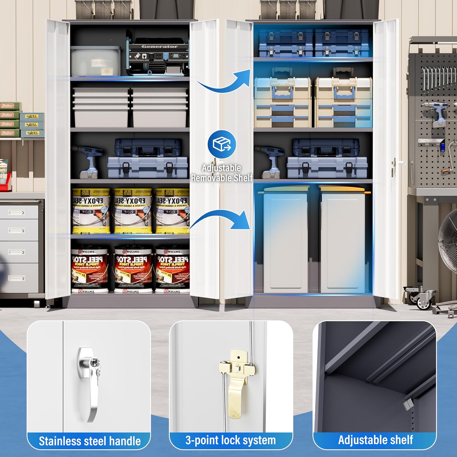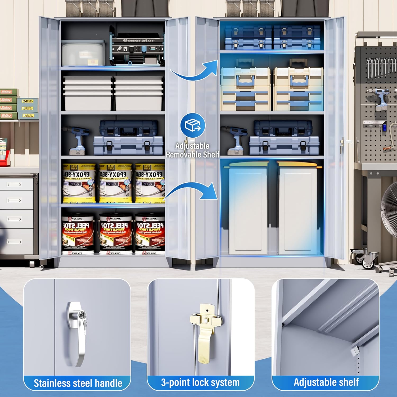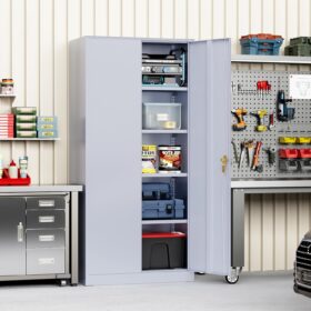 - 【Adjustable Metal Shelves】Greenvelly garage storage cabinet has 4 adjustable metal shelves that can hold up to 180 lbs. each. You can move the height of the shelves to divide the space between the metal cabinet’s tiers. This design provides flexibility to meet your storage space needs.