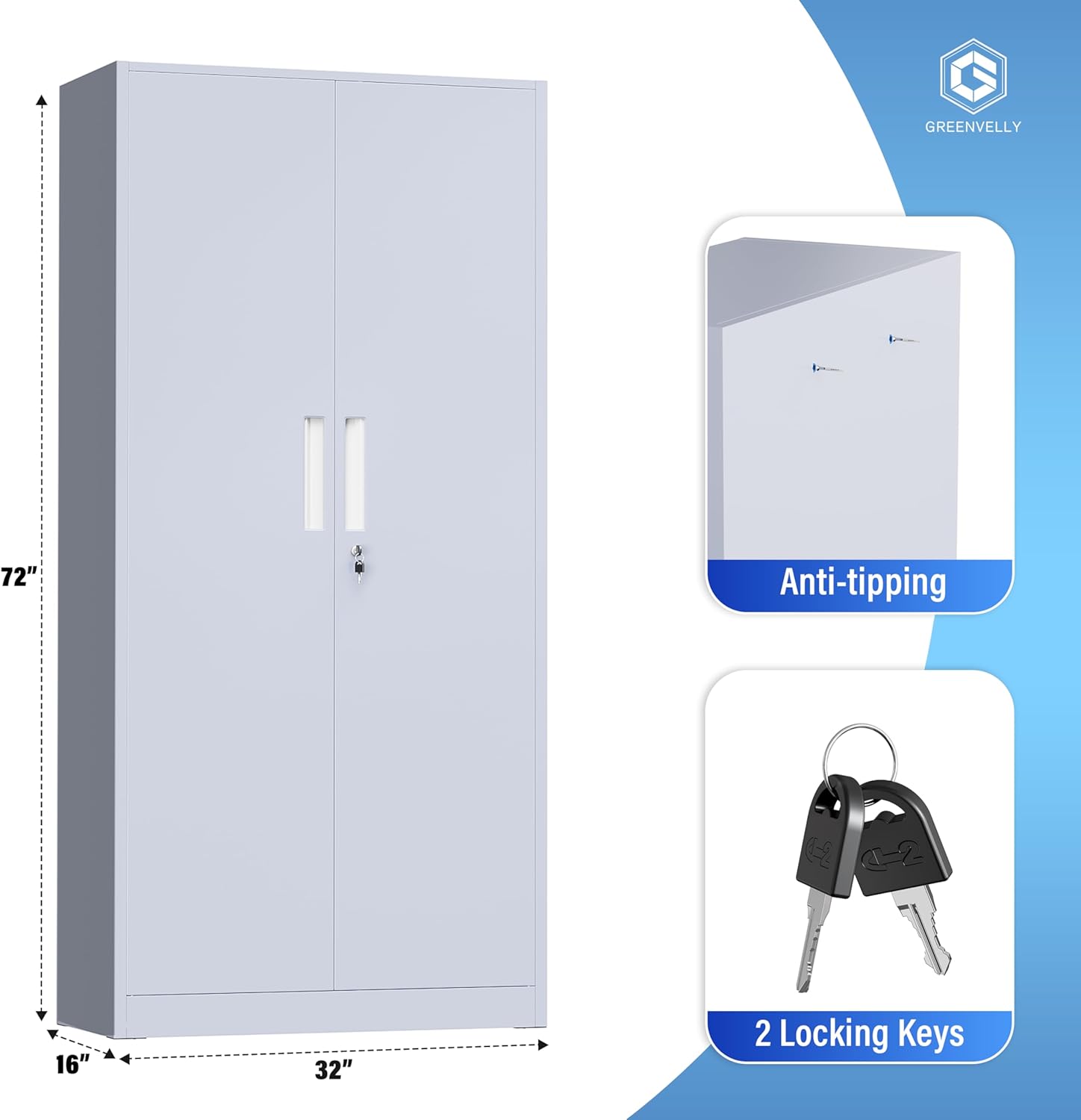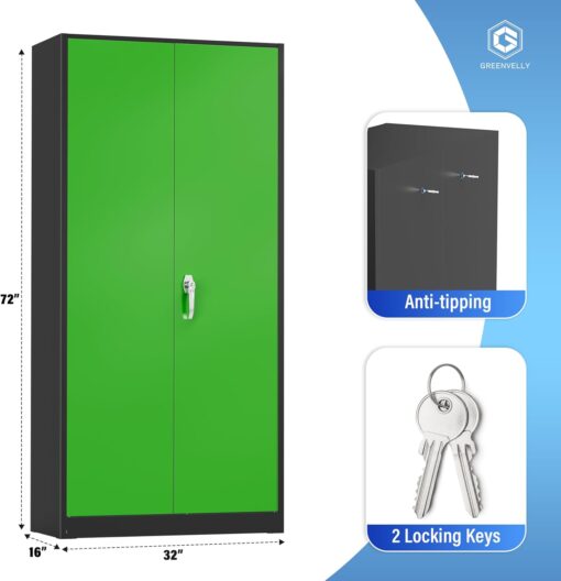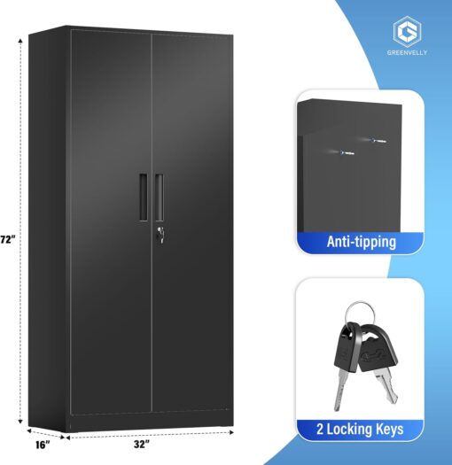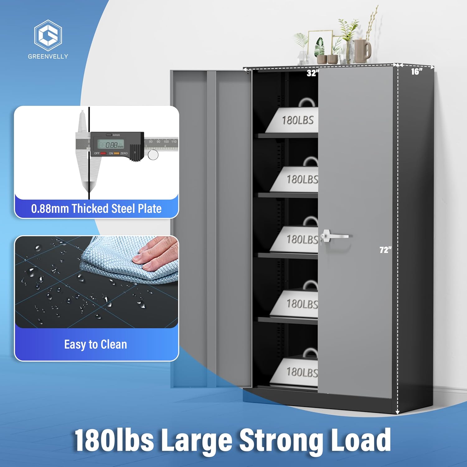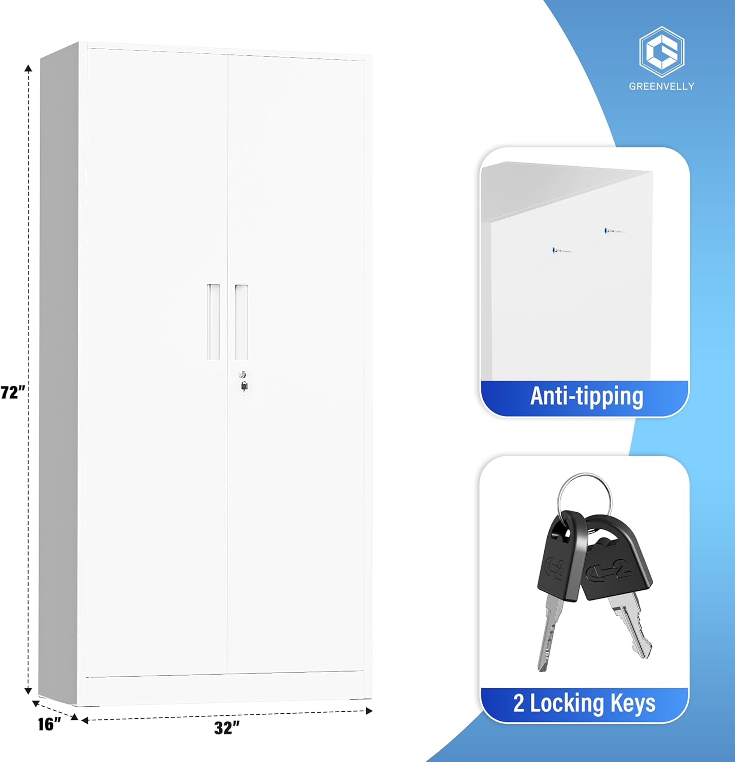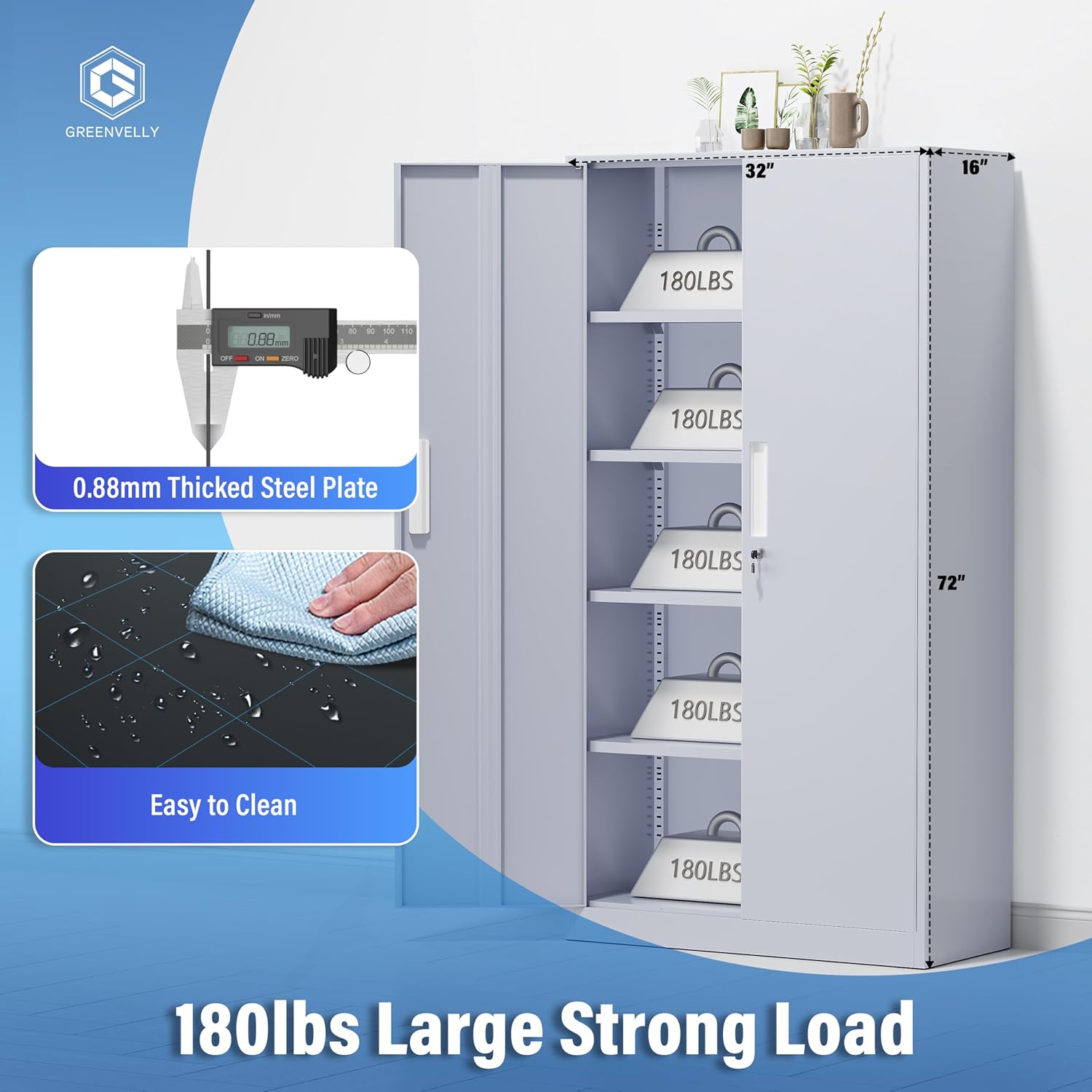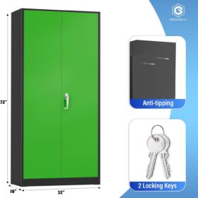 - 【Large Storage Space】Greenvelly metal cabinet can store more than enough items and each shelf has a high weight capacity. Measuring 16 “D x 32 “W x 72 “H, the metal storage cabinet is perfect for storing food, dishes, office supplies, garage tools and more!