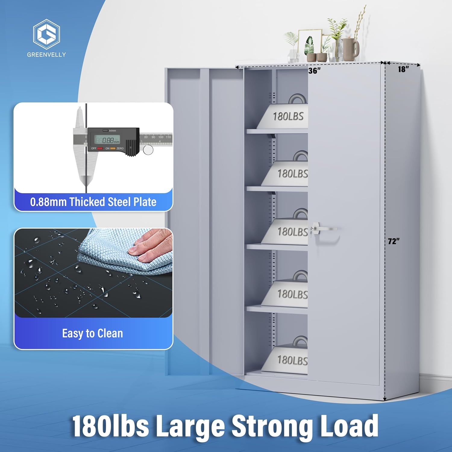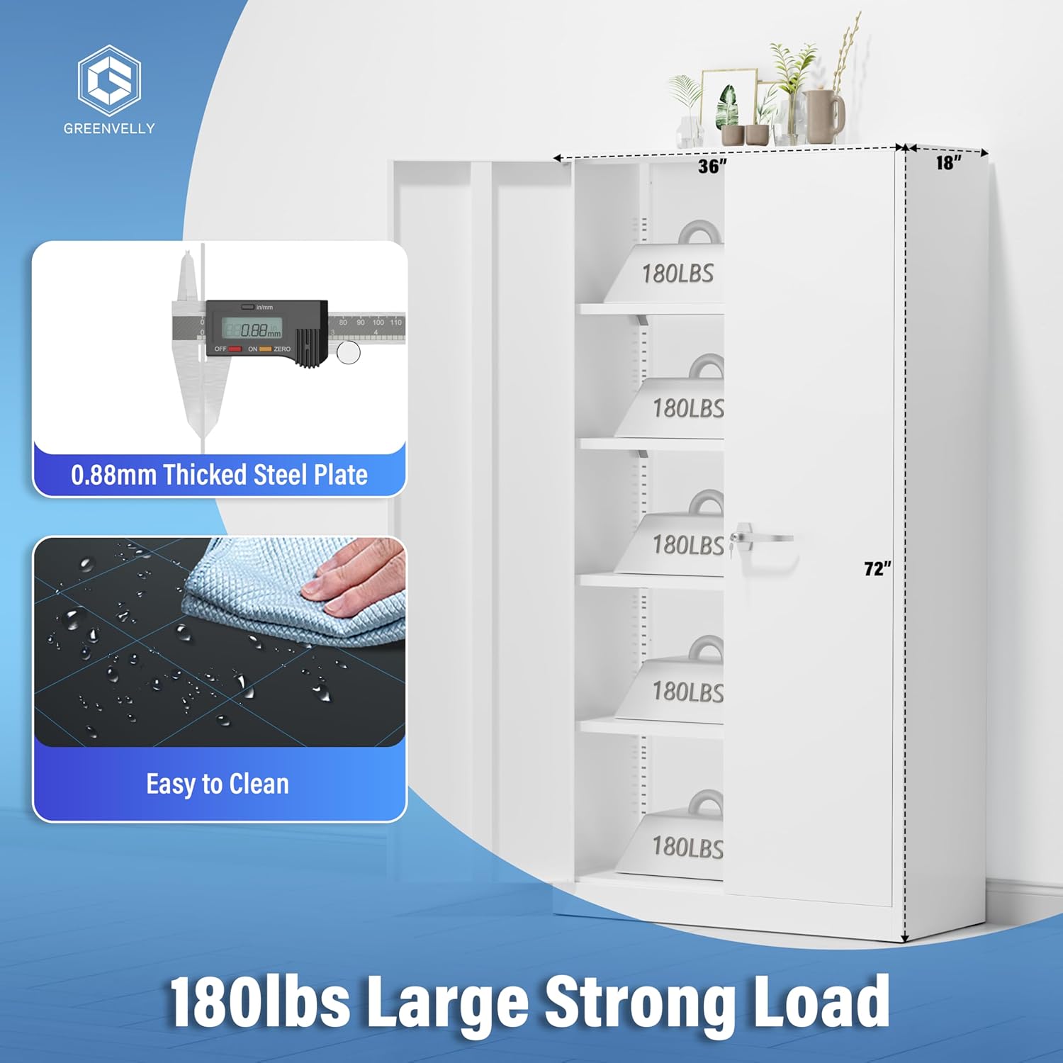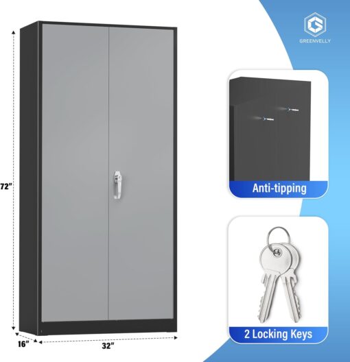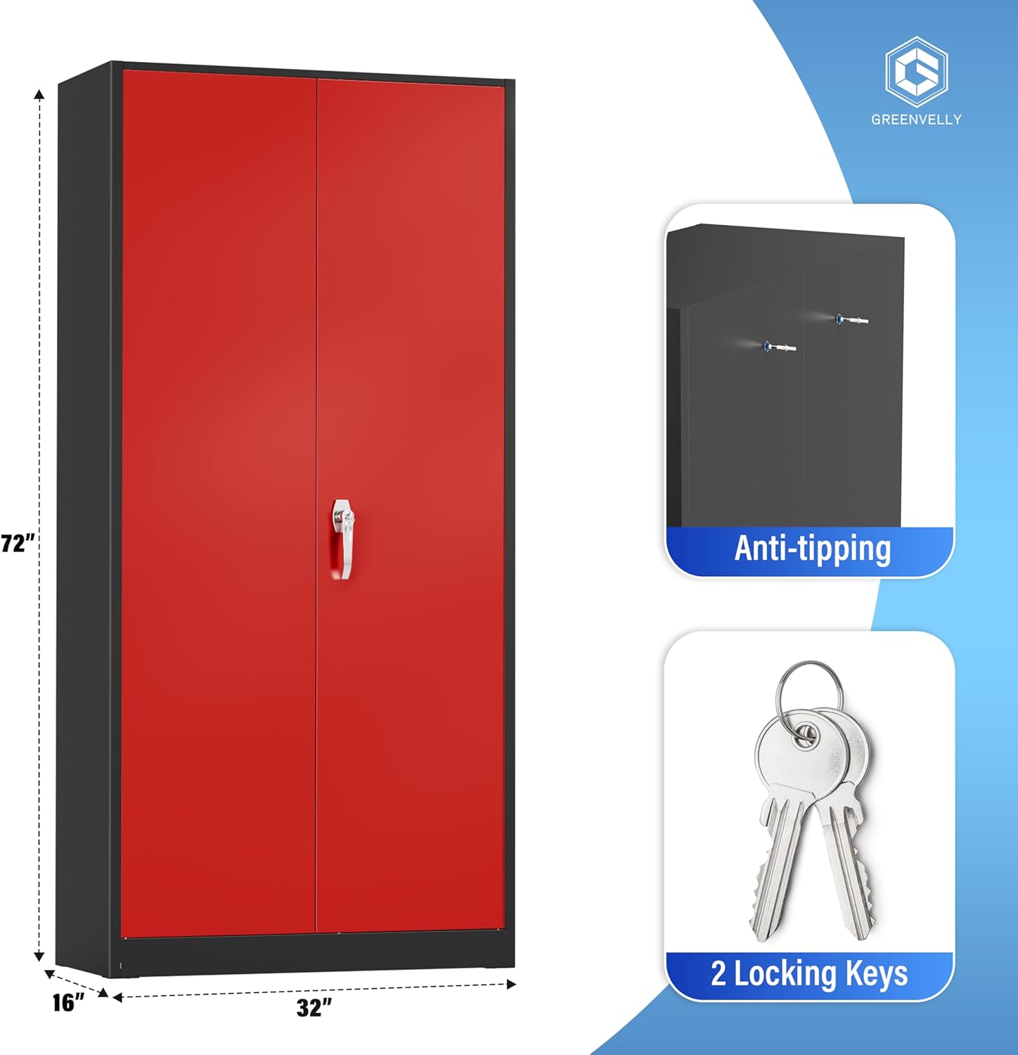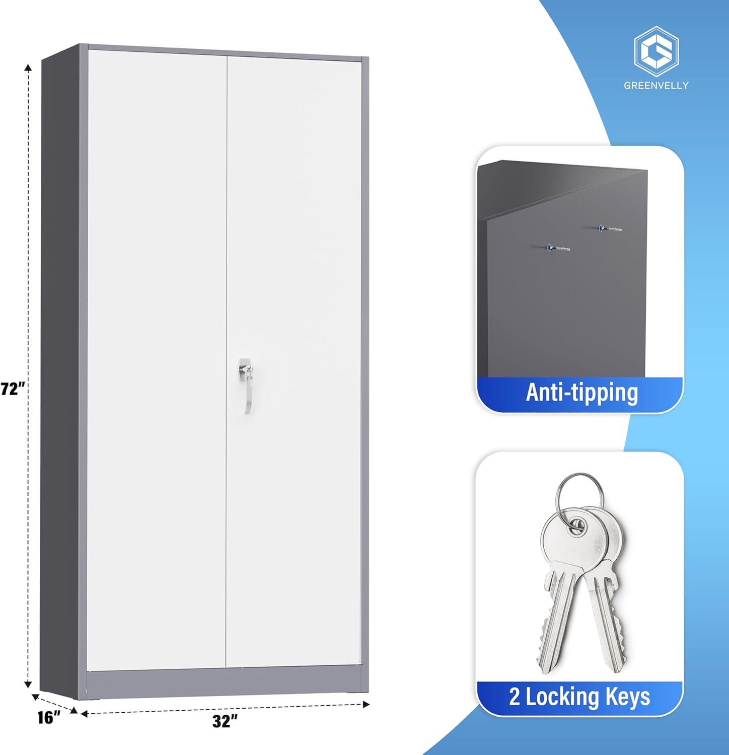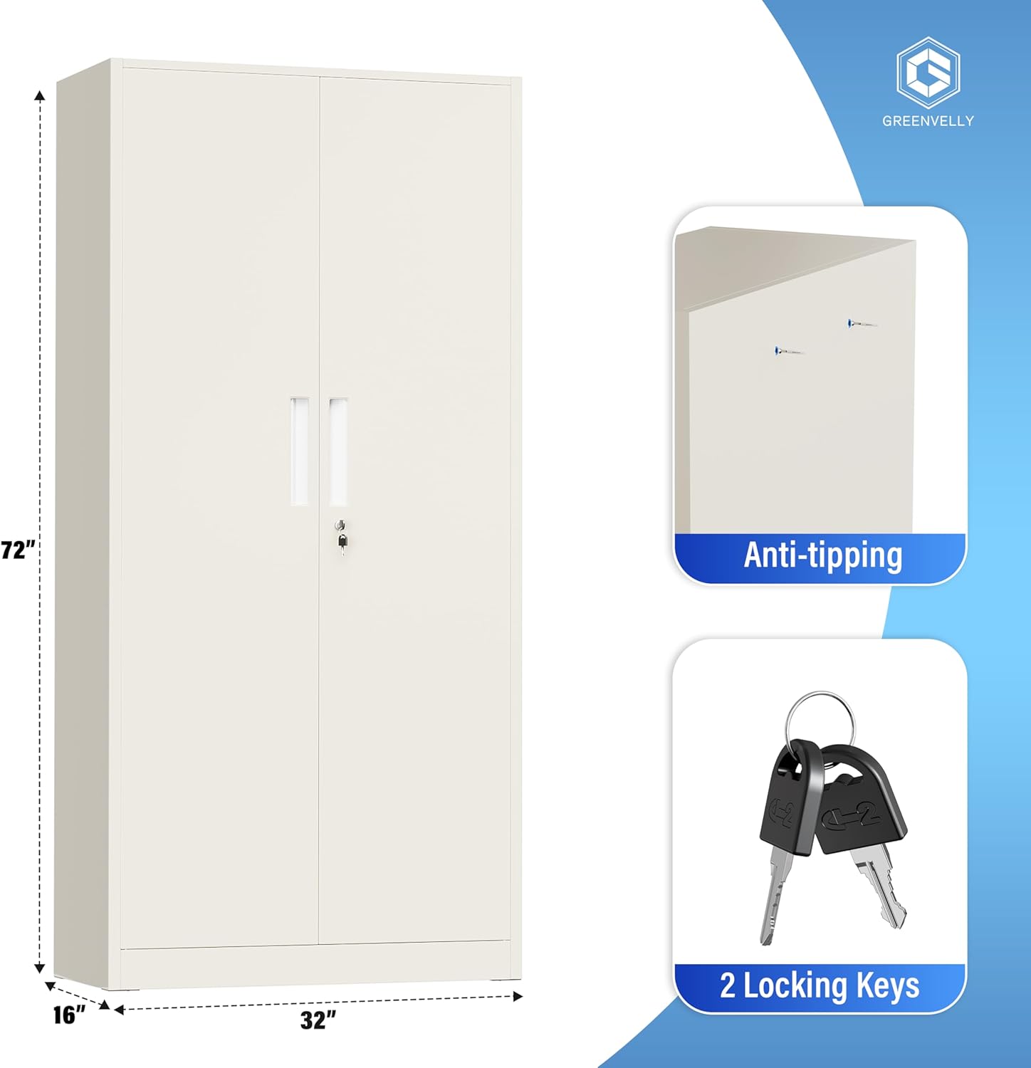 - 【Large Storage Space】Greenvelly metal cabinet can store more than enough items and each shelf has a high weight capacity. Measuring 16 “D x 32 “W x 72 “H, the metal storage cabinet is perfect for storing food, dishes, office supplies, garage tools and more!