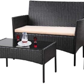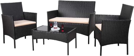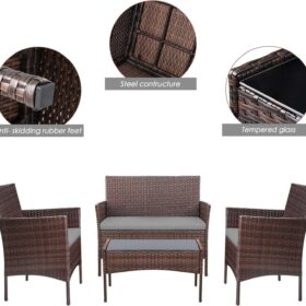 - Modern Style & Useful Table: Simple and smooth line designed appearance, matched with brown rattan and beige cushions, brings a classic and modern sense to this set. Useful tempered glass coffee table is suitable for placing drinks, foods and fruits, to spend a tea time with your families and friends.