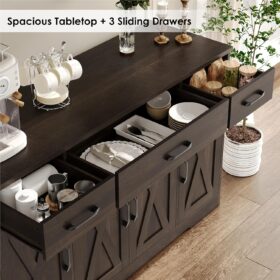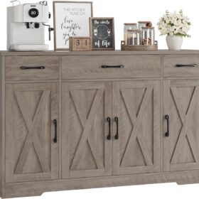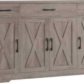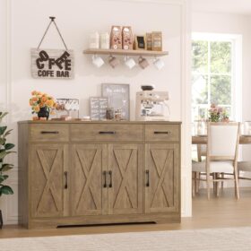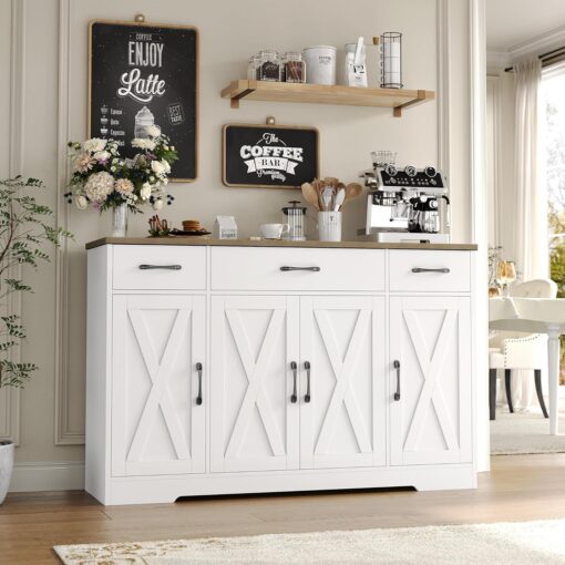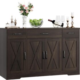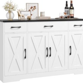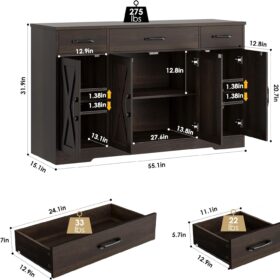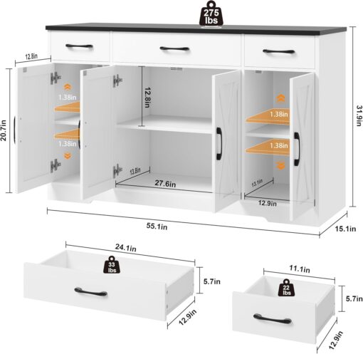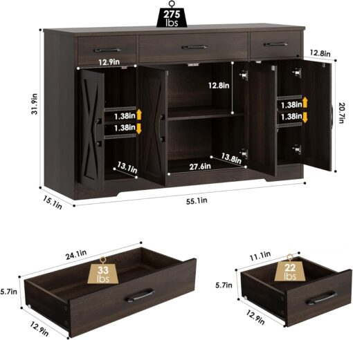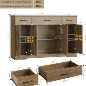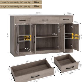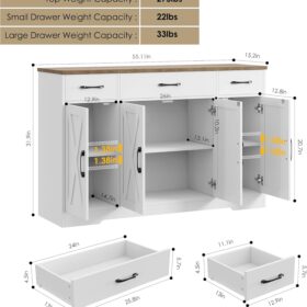 - Crafted to Last: Made of high-quality manufactured wood and smooth-gliding rails in exquisite workmanship, this kitchen buffet with drawers boasts reliable stability and durability to withstand everyday use. Overall size: 15.1″D x 55″W x 31.9″H. Weight Capacity: 300 lbs