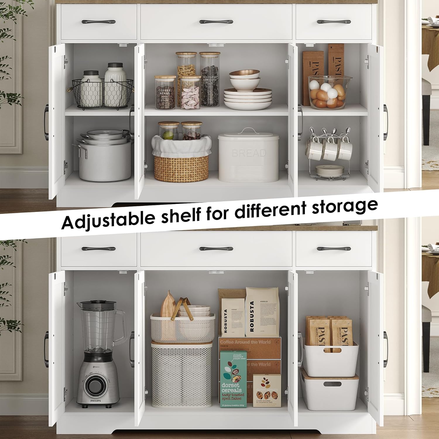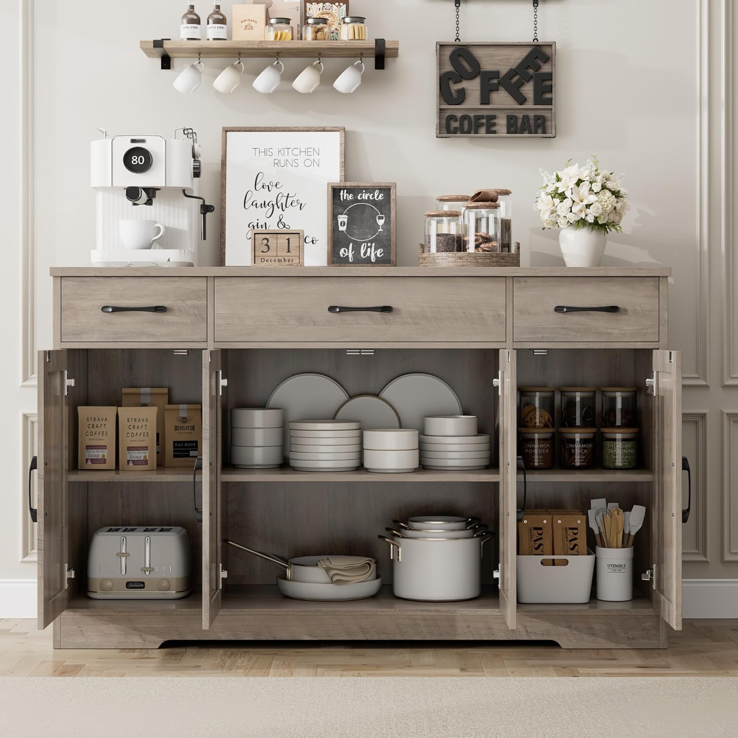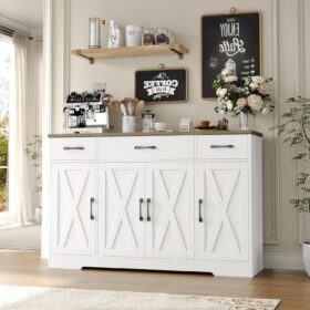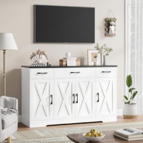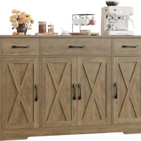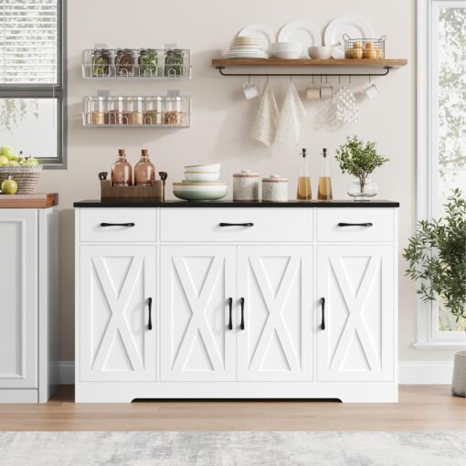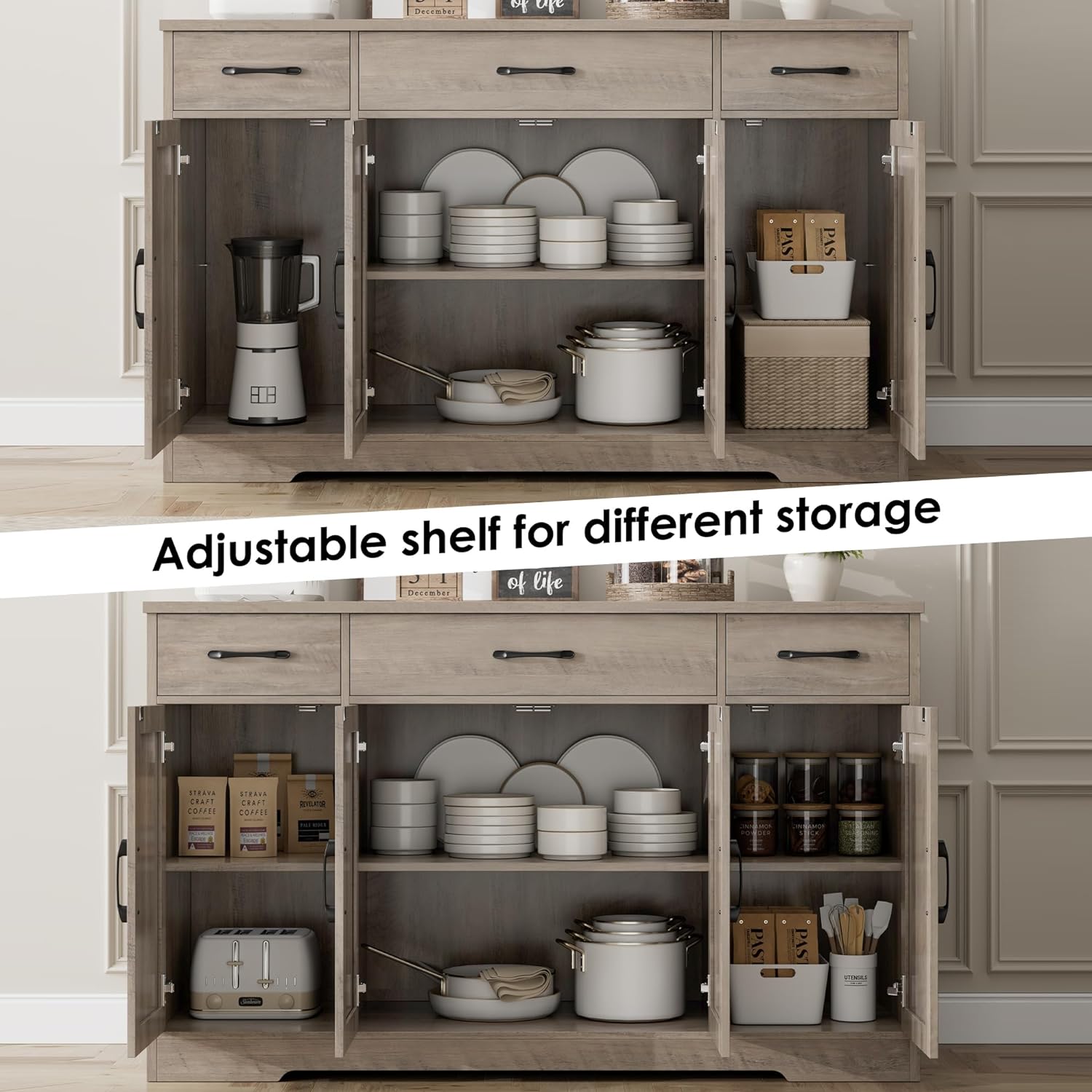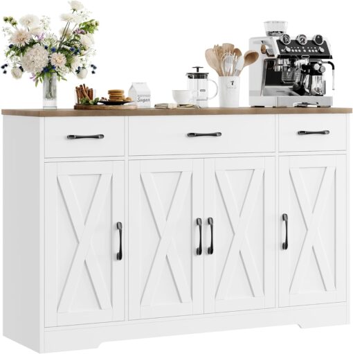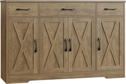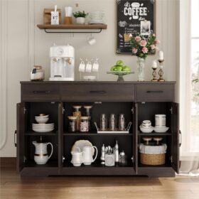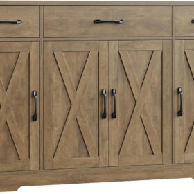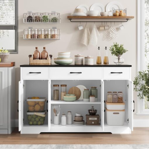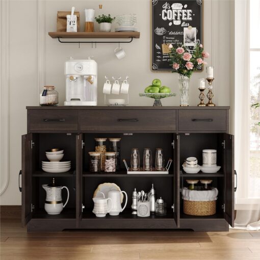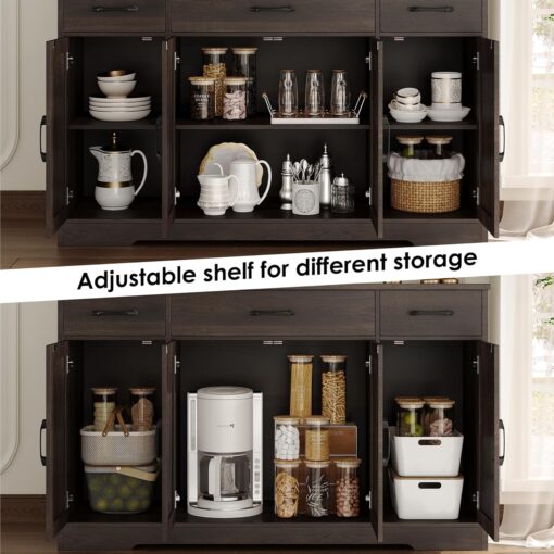 - Large Storage Space: Featured four doors cabinets with one sizeable fixed shelf and two side adjustable shelves with which you can flexibly pack away various household items, and three drawers allow other kitchen overflows to stay in order, this buffet cabinet is sure an essential addition to any loft apartment
