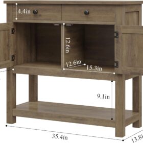 - STYLISH DESIGN: Fusing exquisite wood-effect veneers with striking farmhouse barn-inspired design, this sofa table brings a functional, yet retro storage space, while adding a hint of glamour to your home. Overall dimensions: 13.8″ D x 35.4″ W x 33.5″ H