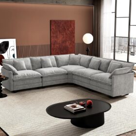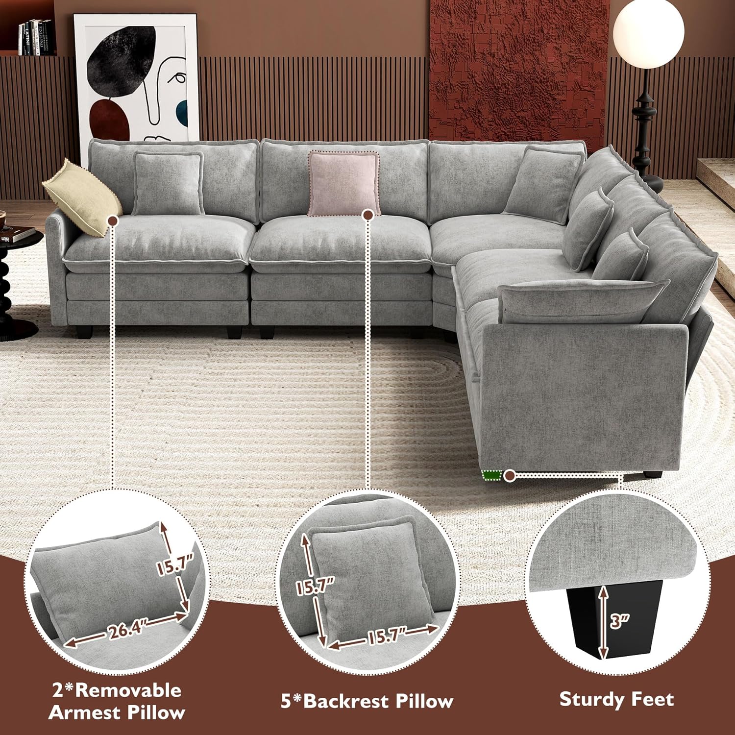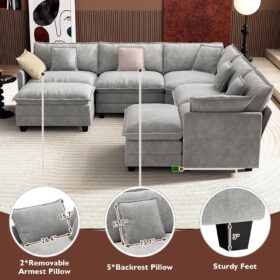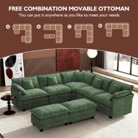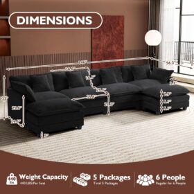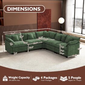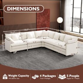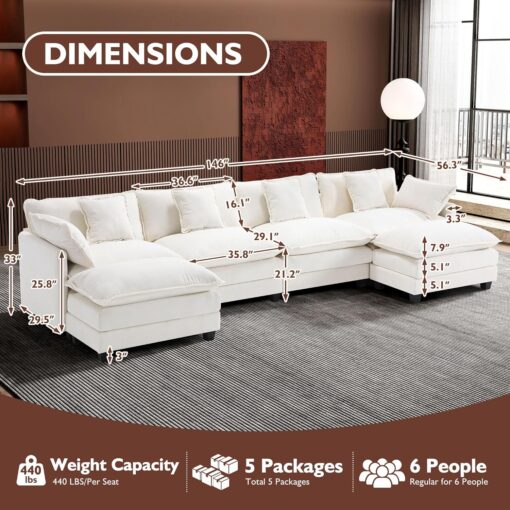 - 【Five Boxes Packaging & Easy Assembly】Overall Size: 56.3″D*146″W*33″H. Ottoman Dimension: 22.8″W*37″D*21.2″H. We put all the parts in five boxes for easy transport and sometimes they arrive at different times. The package includes all numbered parts, tools, and clear instructions. It comes with necessary tools, so no additional equipment is required. You can install it in 30 minutes by using the included detailed instructions. If you have any problem with the receiving, please contact us promptly