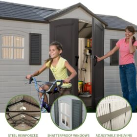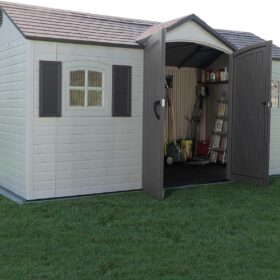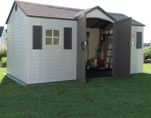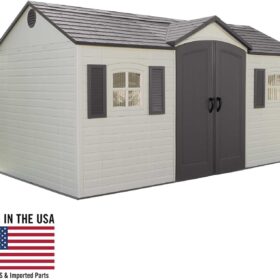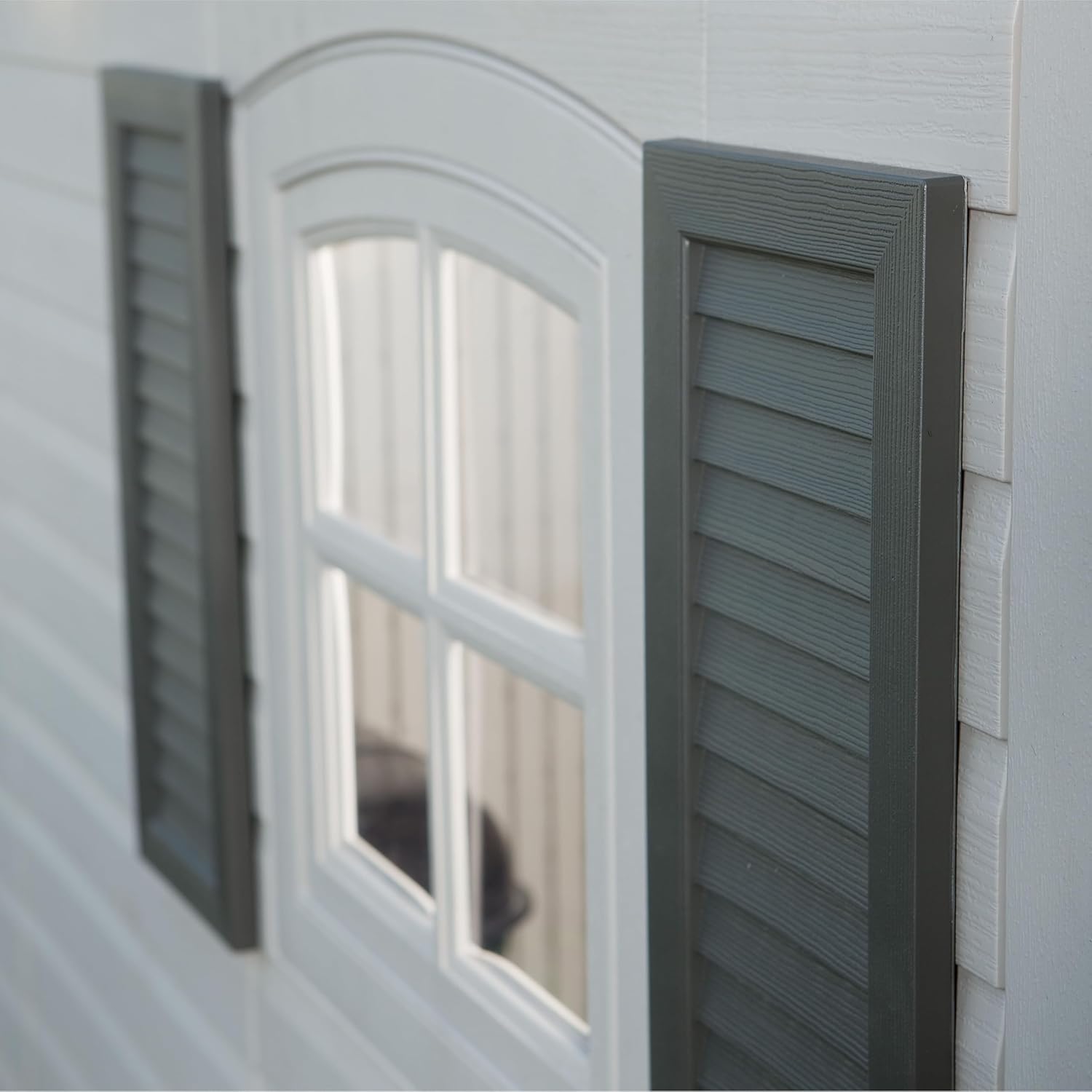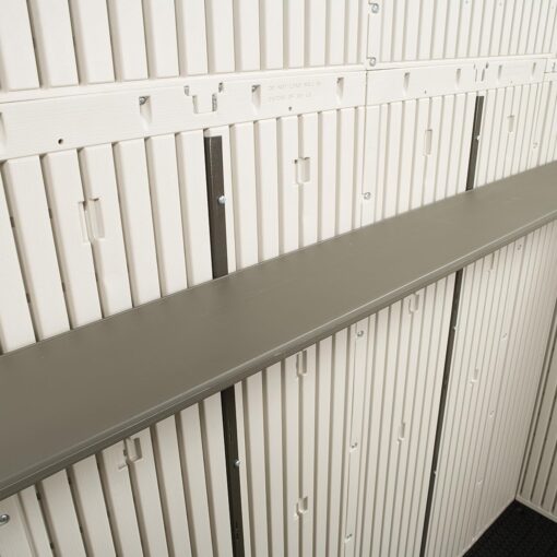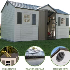 - Features- 6 small skylights, 2 shatterproof polycarbonate windows, 2 screened vents, 2 decorative shutters, 2 peg strips, 2 90″ x 9″ shelves, 4 corner shelves.