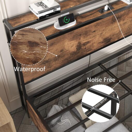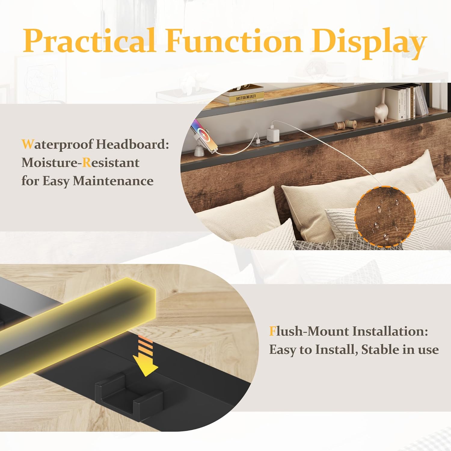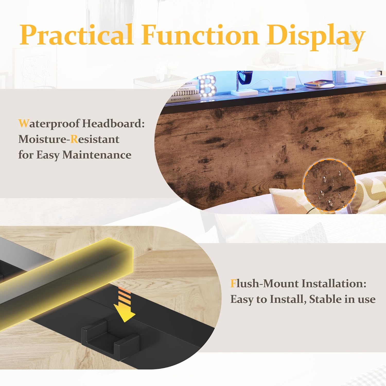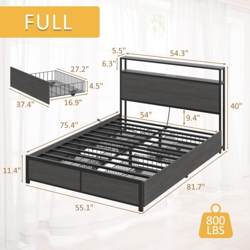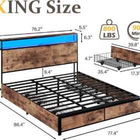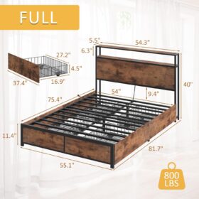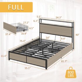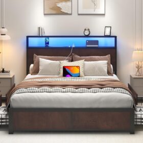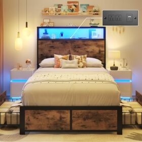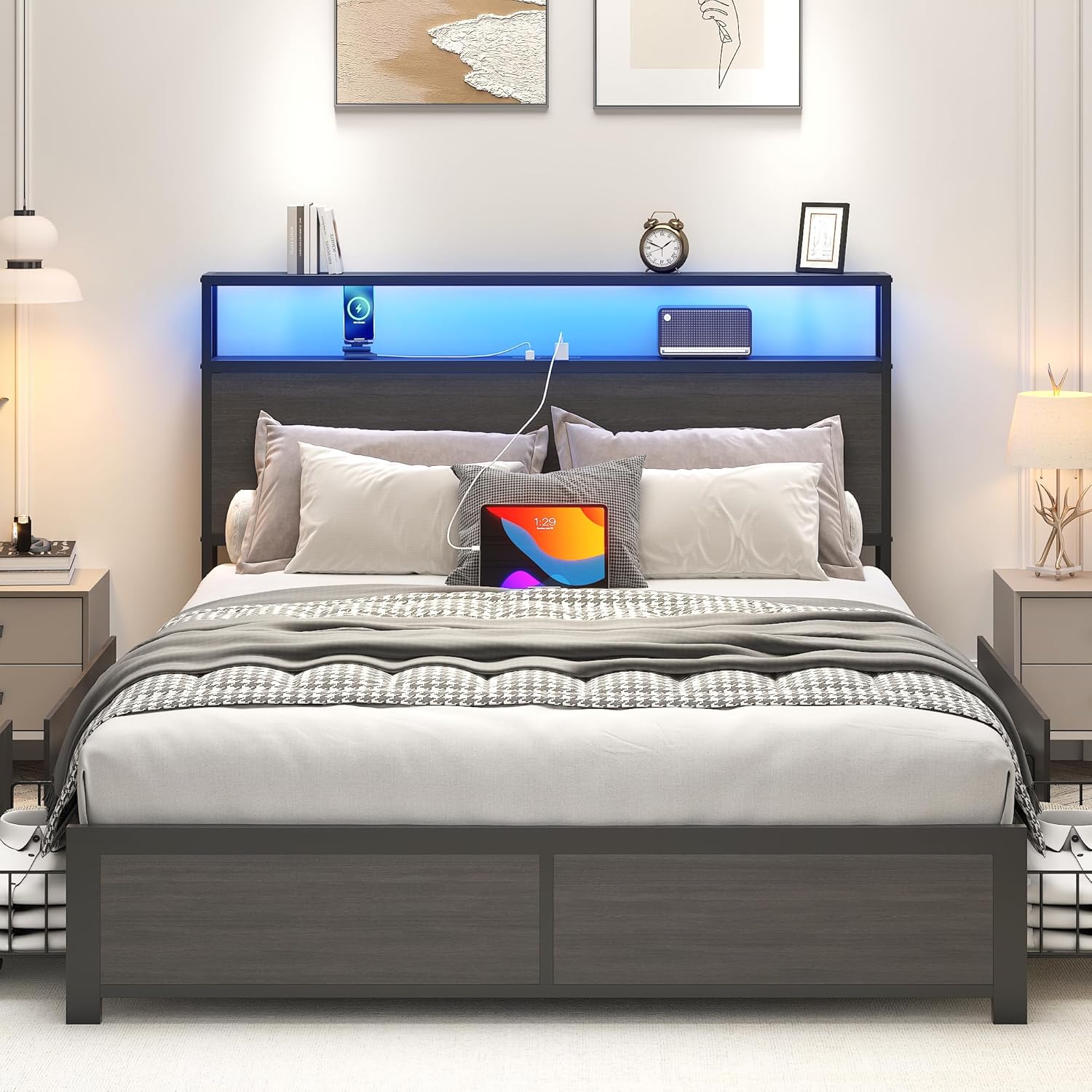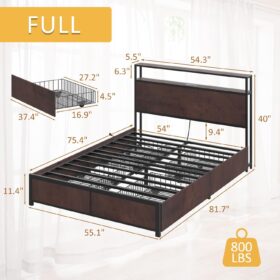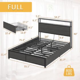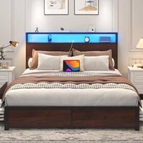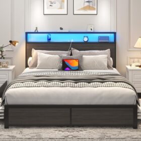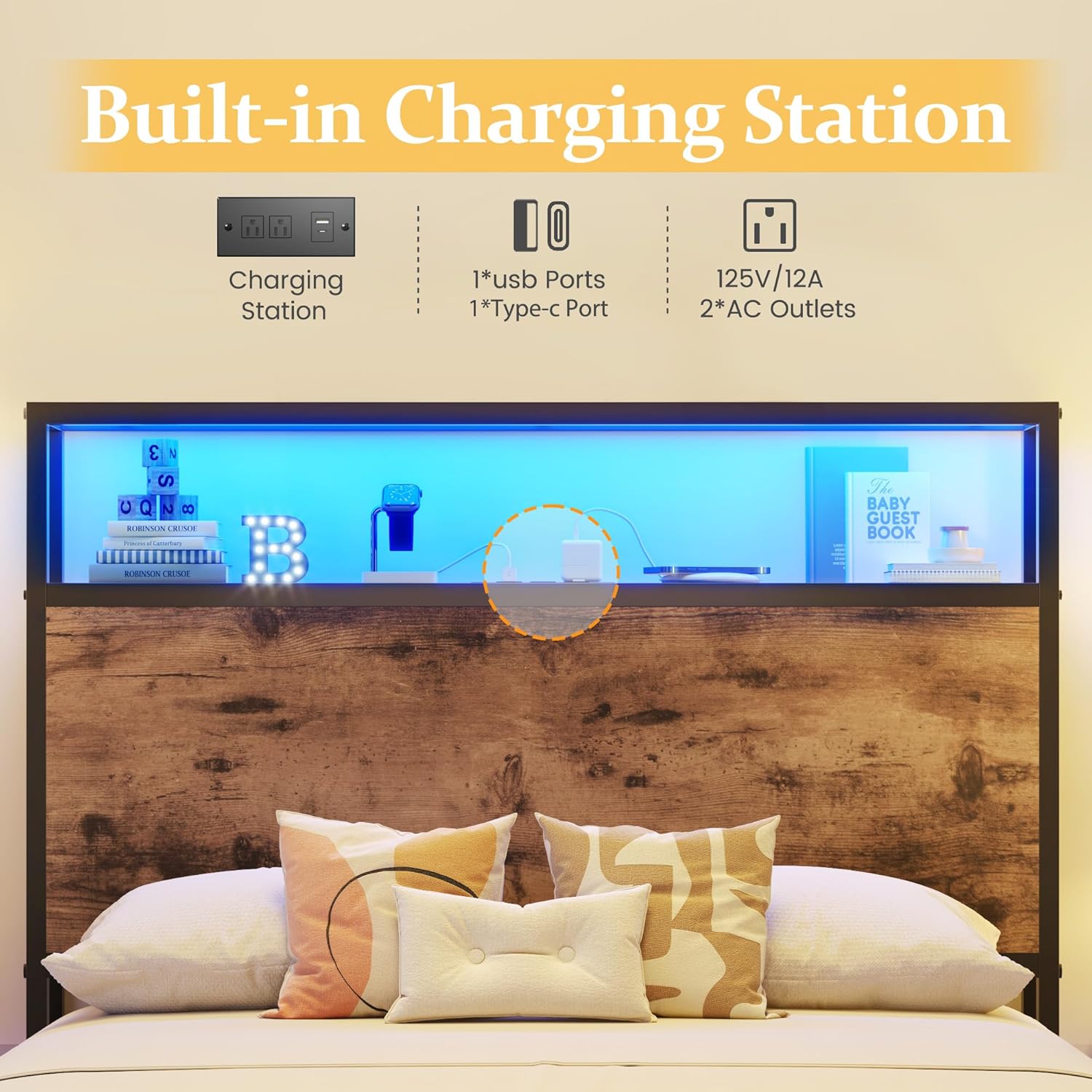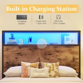 - 【Storage Headboard with Charging Station】The headboard is equipped with a built-in charging station, including 2 AC Outlets, a USB port and a type-C port, allowing you to charge various electronic devices within easy reach. 2-Tier Storage shelf on the headboard can provide more storage space, making it convenient for you to place commonly used items such as magazines, phones, alarm clocks, etc