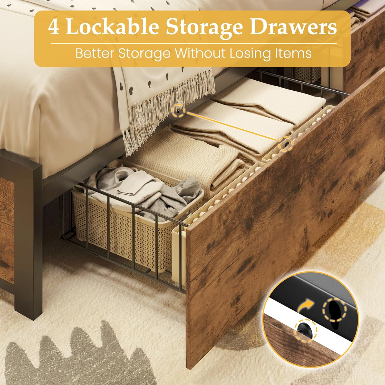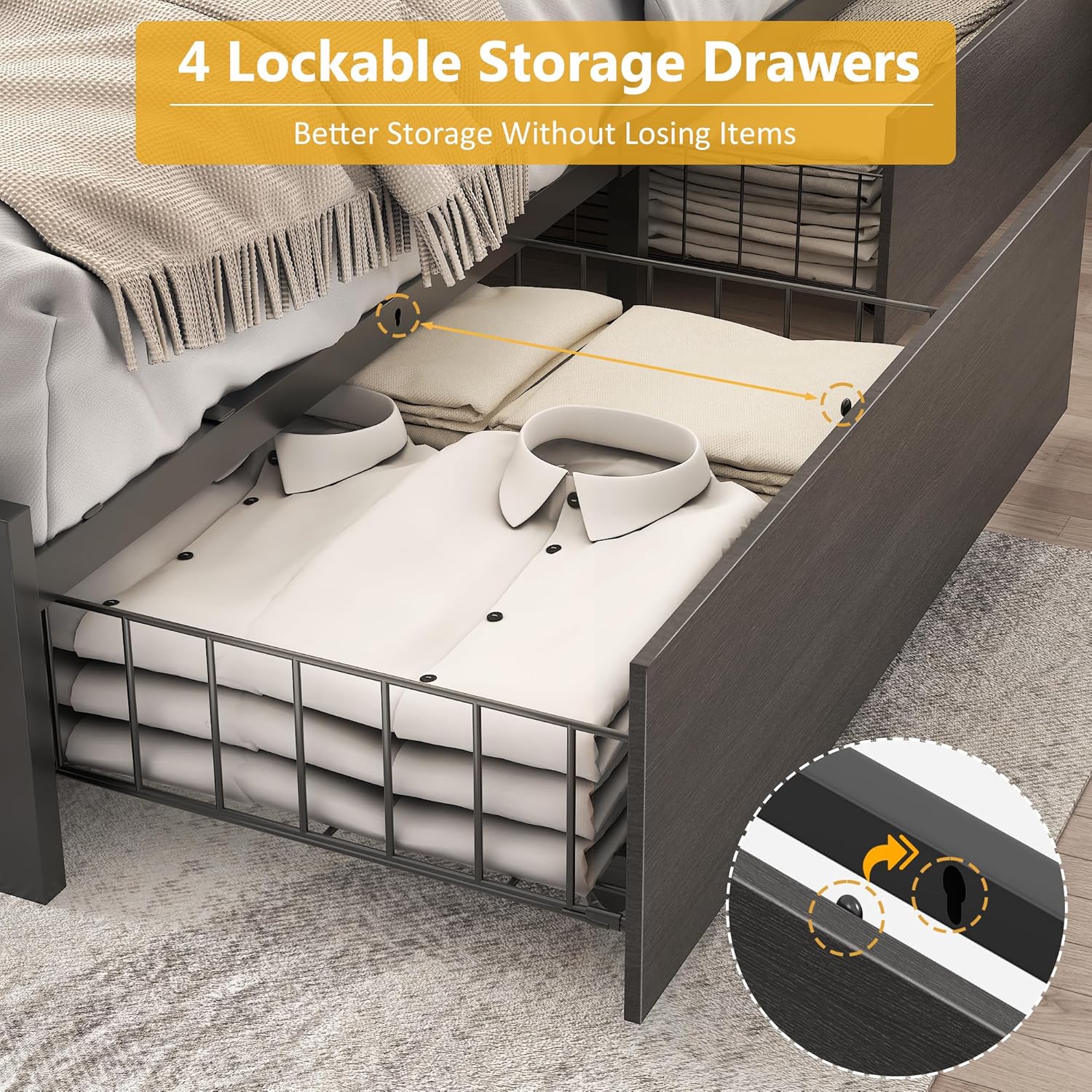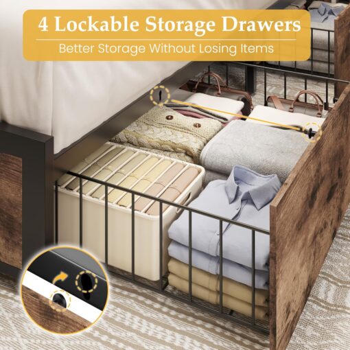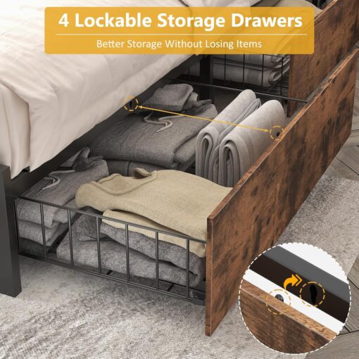 - �? Sliding Storage Drawers�?4 sliding drawers of this bed frame are designed to make this bed more practical. These drawers not only can store seasonal clothes and other belongings. The drawer also comes with screw clips, which you can easily secure drawers to the bottom of the bed to prevent the drawer from slipping out.