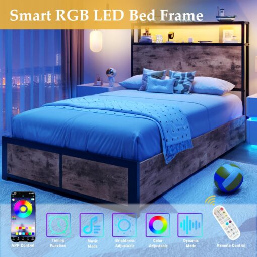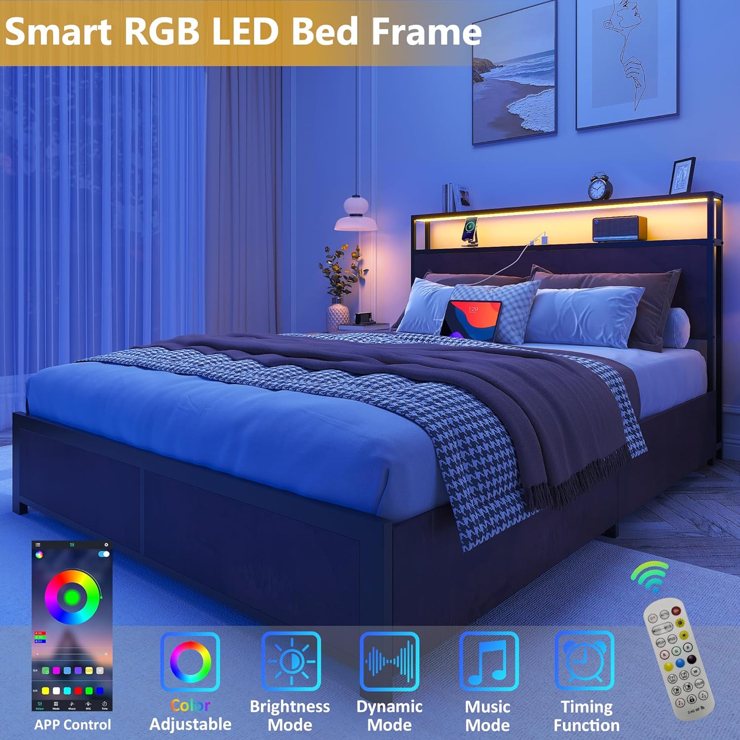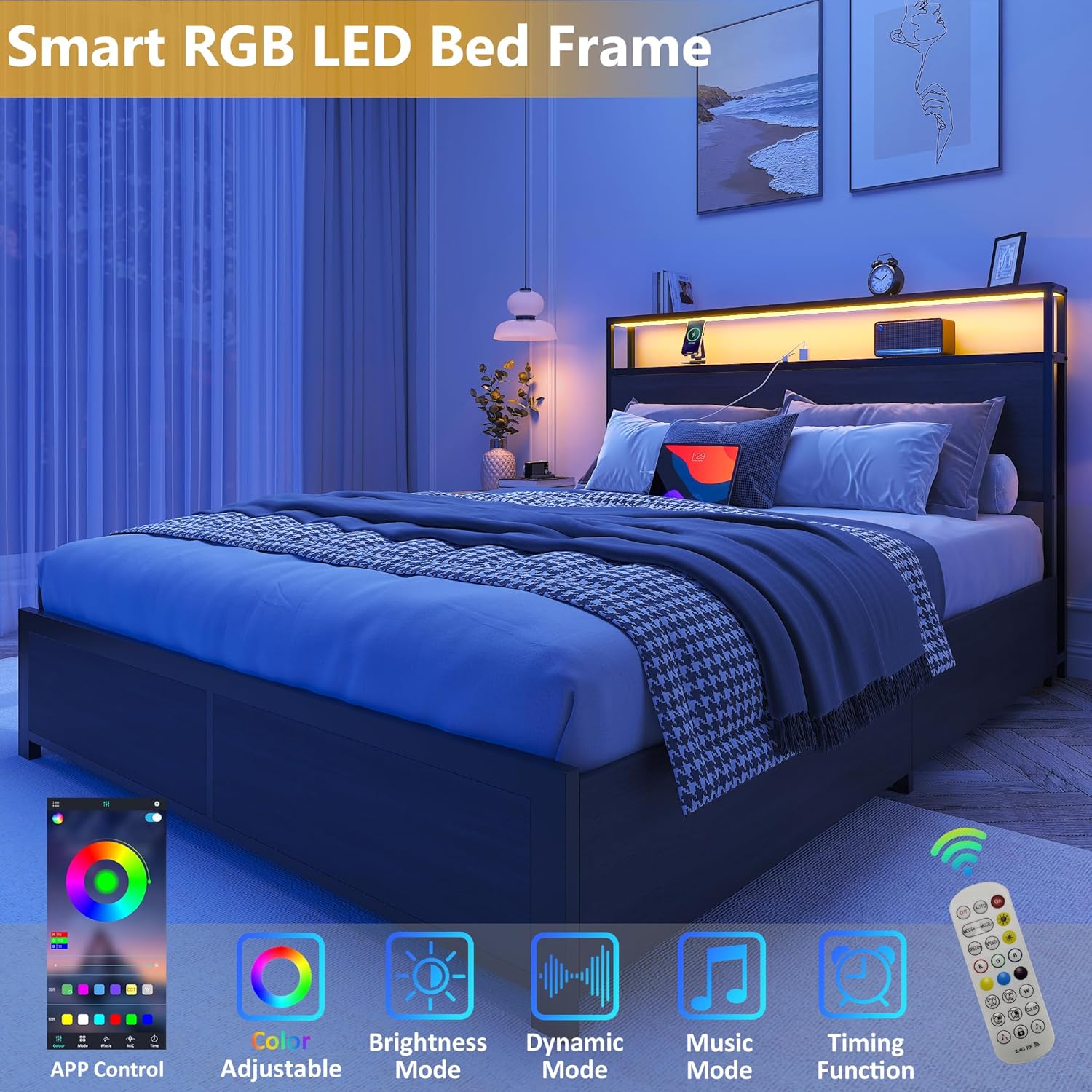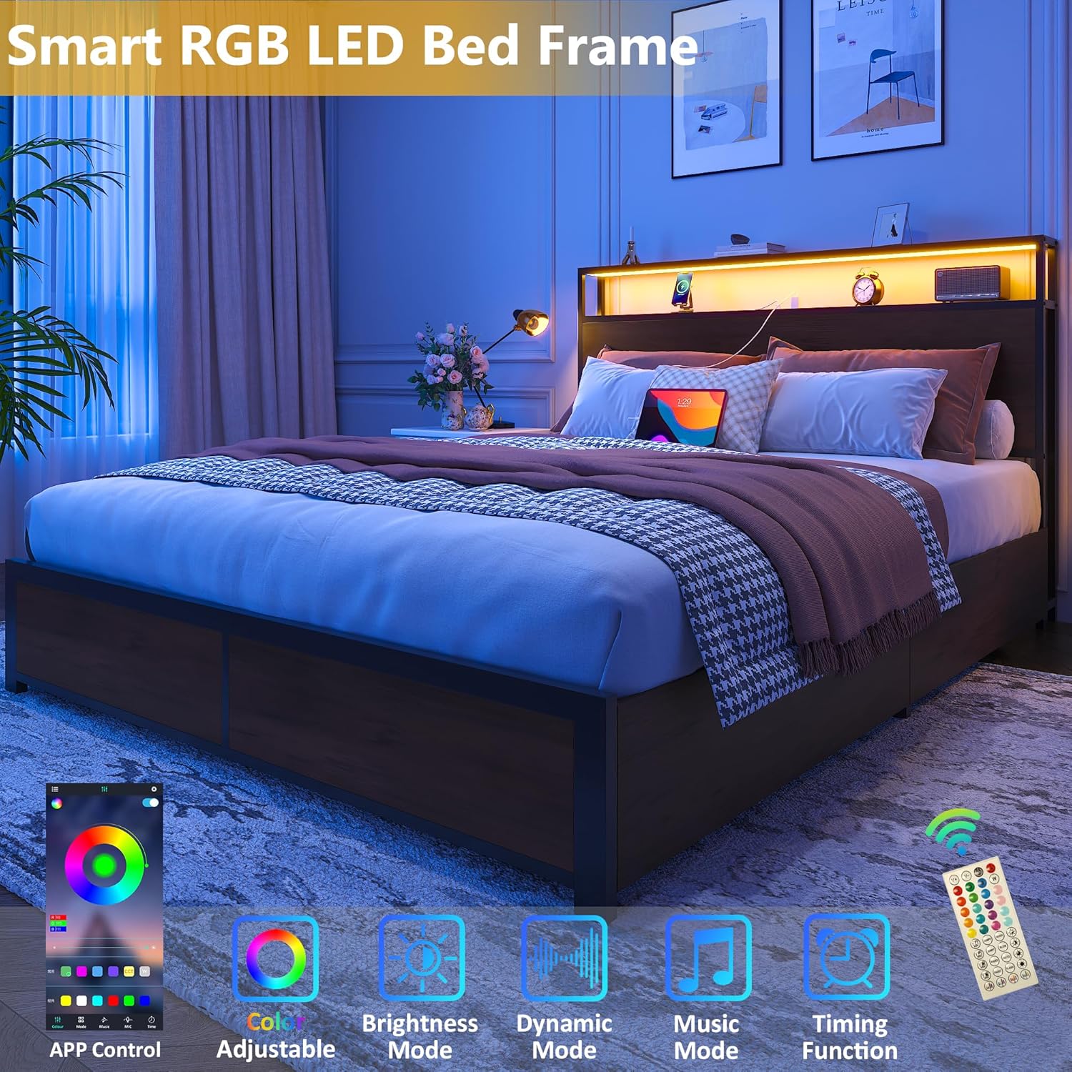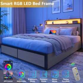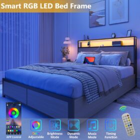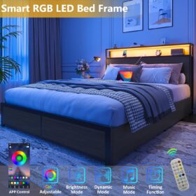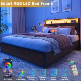 - 【RGB LED Light Bed Frame】This Bed frame is equipped with RGB LED light belt, you can use the equipped remote control or mobile APP to set the LED color, brightness, mode, timing function, etc., to meet the needs of different styles and different scenes, make your home life more colorful. The LED function comes with detailed instructions, and you can follow the instructions to complete the corresponding settings.