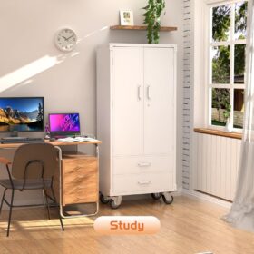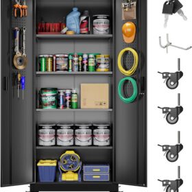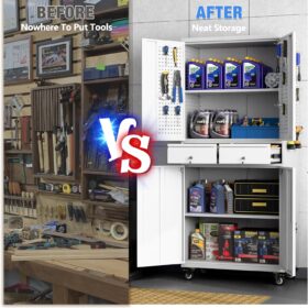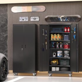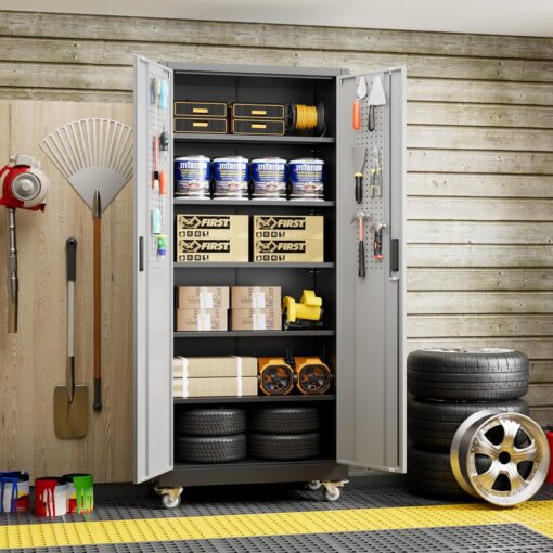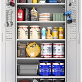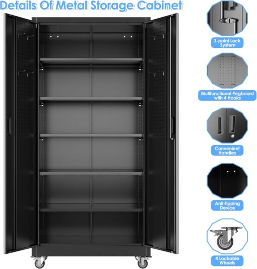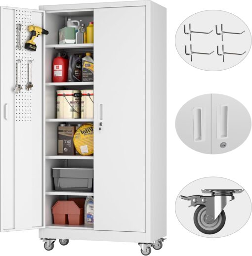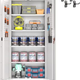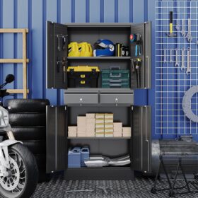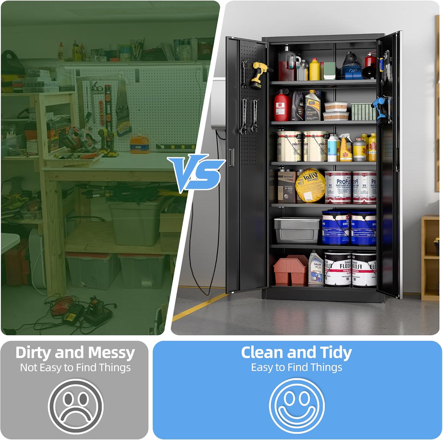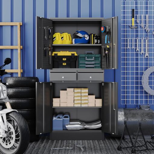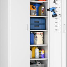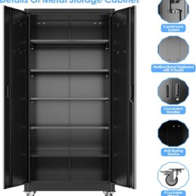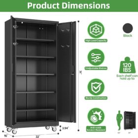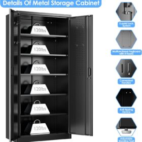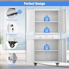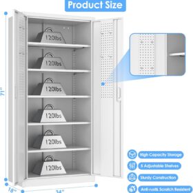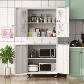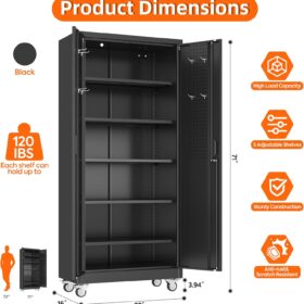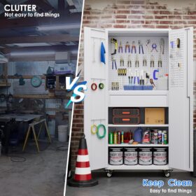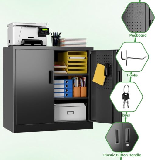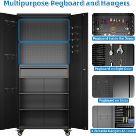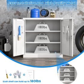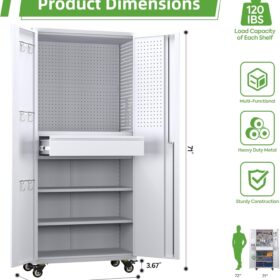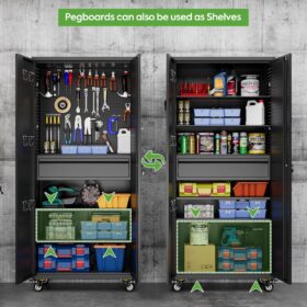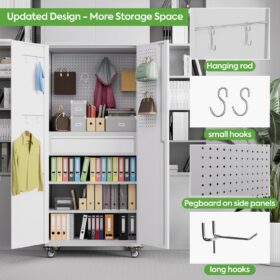 - New Upgrade:Metal Cabinet has lots of room to organize your belongings.In order to meet customer storage requirements, the newly upgraded metal cabinet with Pegboard(Including 4 hooks�?for storing tools and other items, fully utilizing space