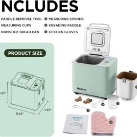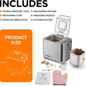 | Included Components | Bread Maker Machine*1, Bread Pan*1, Kneading Paddles*2, Measuring Spoons*1, Paddle Removal Hook*1, Measuring Cup*1, Heat Resistant Mitt*1, User Manual*1 |
