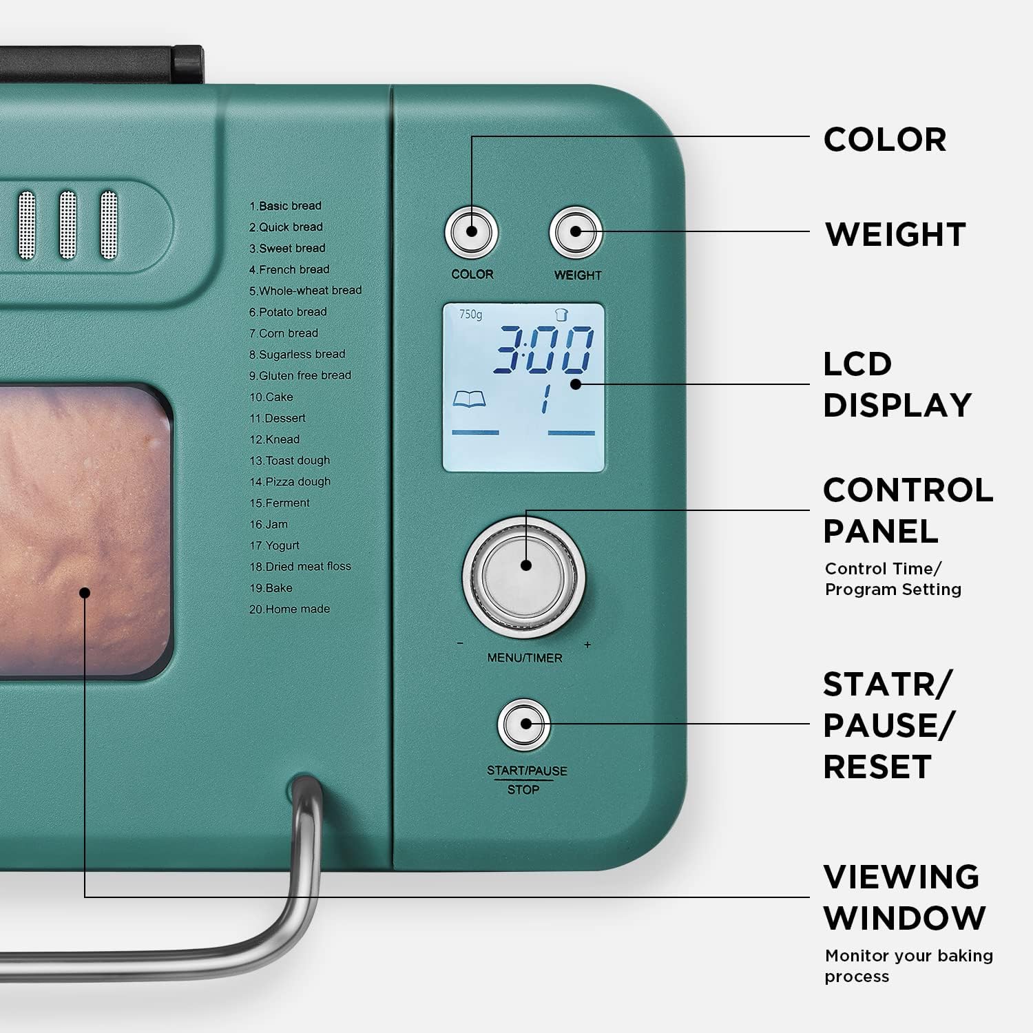 - 20 PROGRAM MENUS & 2LB LARGE CAPACITY: Our bread maker has 20 customized automatic programs(basic/ quick/ french/ sweet/ whole-wheat/ gluten-free/potato/ corn/ sugerless/ cake/ dessert/ knead/ toast dough/ pizza dough/ ferment/ bake/ jam/ yogurt/ dried meat floss/ homemade) and 3 crust colors( light/ medium/ dark) for you to choose. The loaf capacity of bread maker machine is 1.65LB and 2LB, which could serve 5~6 people at once.