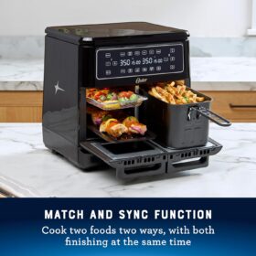 - Match and Sync Functions: Two temperature independent 5.5-qt. (5.5 L) zones function like two mini ovens. Cook food in both zones at the same time and temperature; or cook two foods two ways, with both finishing at the same time.