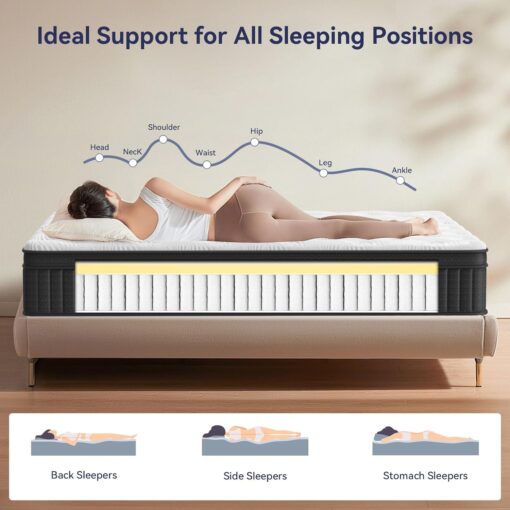 - 【Individually Pocketed Springs for Targeted Support】The queen size mattresses features hundreds of independent pocket springs that work independently to contour to your body, providing stable support along your curves. It delivers exceptional comfort and personalized support, ensuring undisturbed sleep even if your partner tosses and turns, so you can enjoy a peaceful rest.