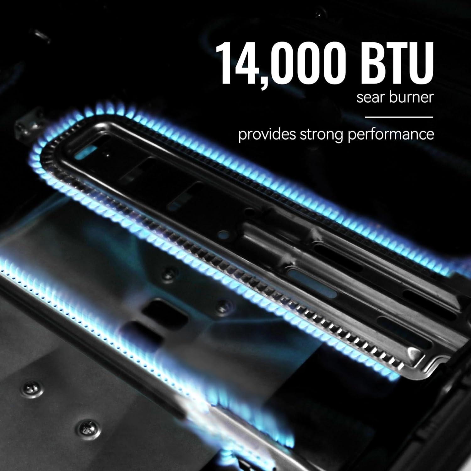 - Sear Burner & Side Burner: Sear burner generates 14,000 BTU to provide strong performance for quick and even heat distribution; lidded side burner offering 10,000 BTU is ideal for cooking side dishes and sauces