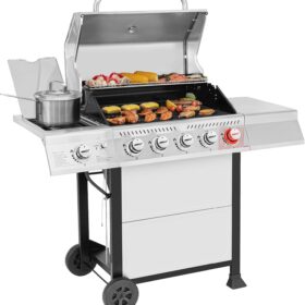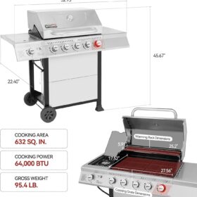 - High Performance: This propane gas grill has 4 main burners (10,000 BTU each), a sear burner (14,000 BTU) and a lidded side burner (10,000 BTU). 6 stainless steel burners offer a total of 64,000 BTU output for delivering even heat