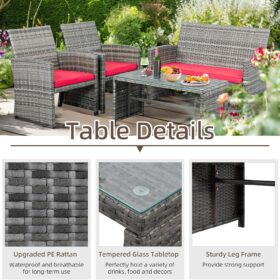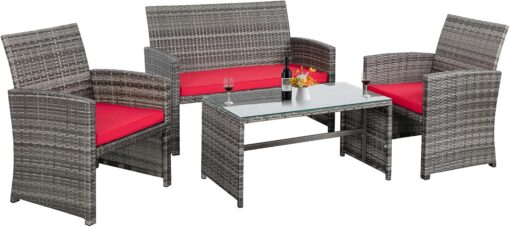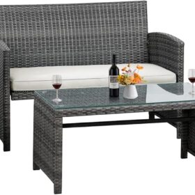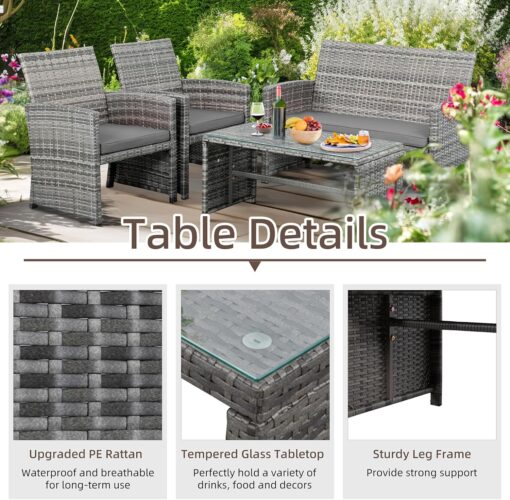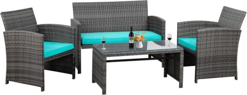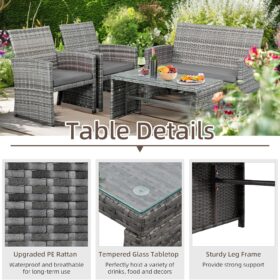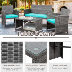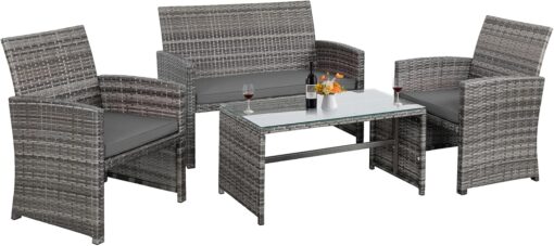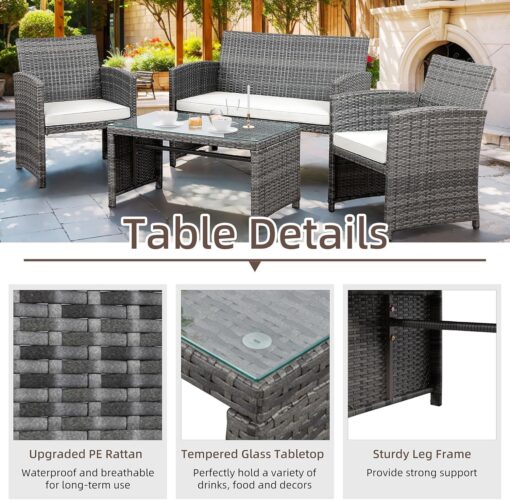 - 【Exquisite Tempered Glass Table】Our outdoor four-piece set comes with a coffee table with a tempered glass top to create a smooth, sturdy surface for food and drinks; don’t worry about overturning liquids, as the glass tabletop can be restored with a simple wipe. All while adding a touch of elegance to your outdoor space.