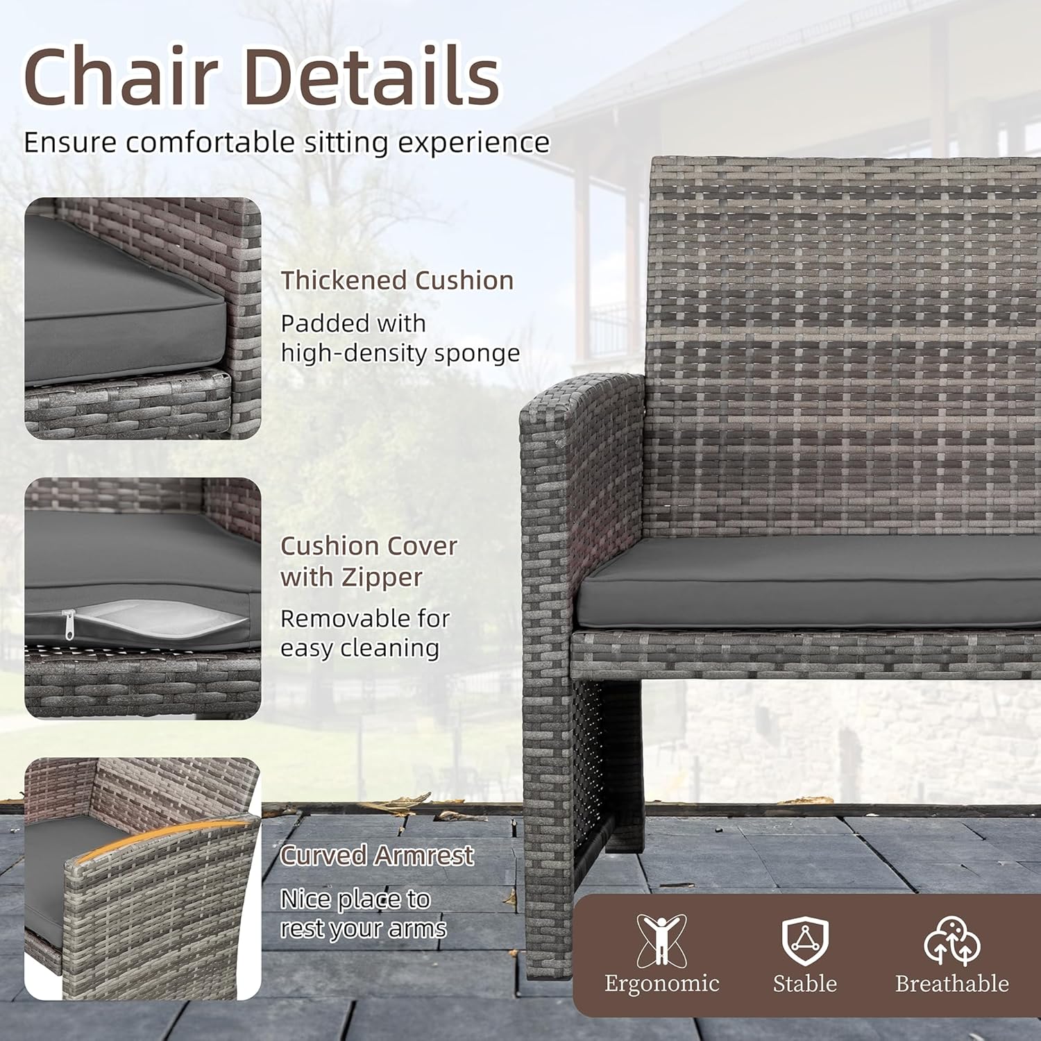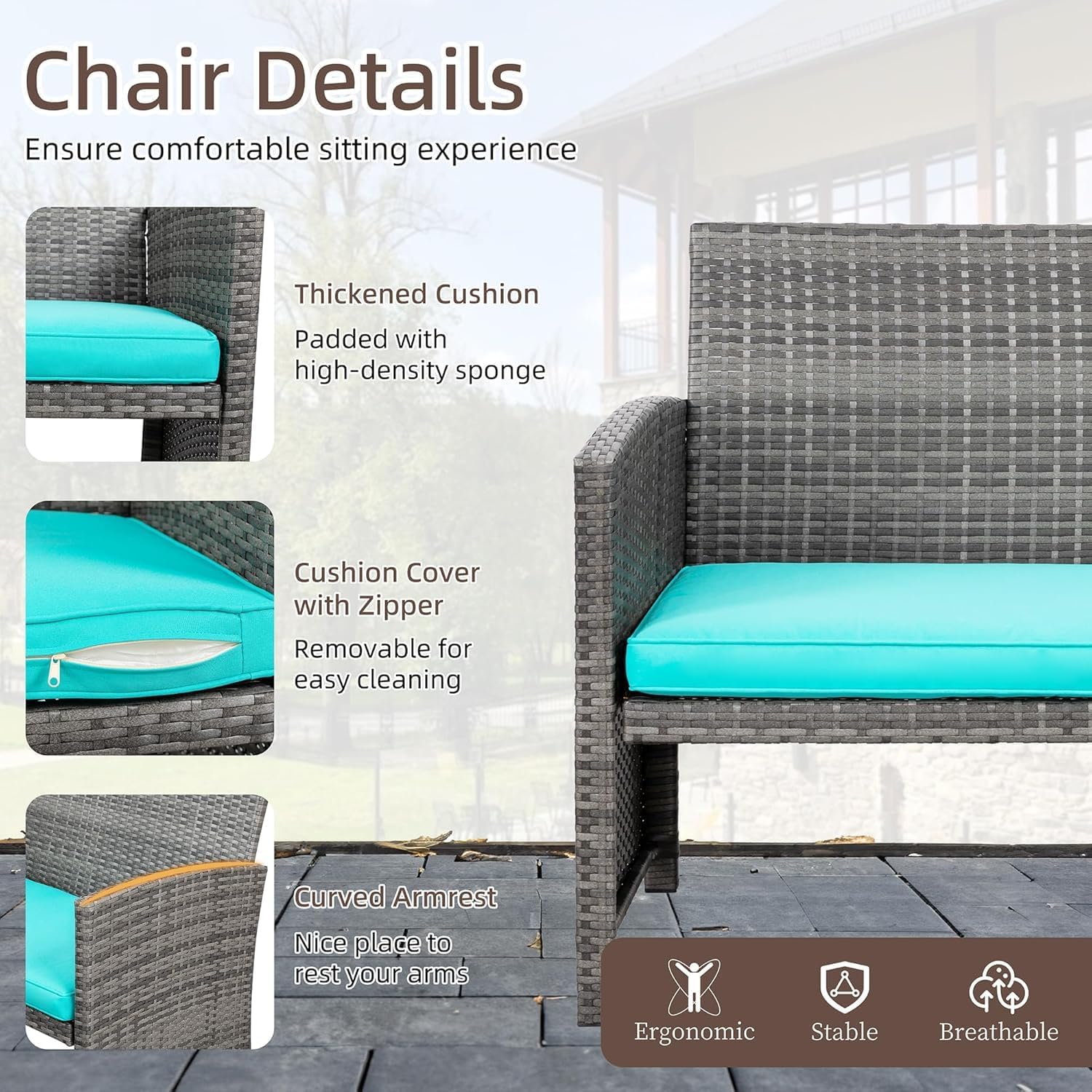 - 【Ergonomic & Comfortable】Our patio conversation furniture set has an ergonomic curved armrest and backrest to reduce stress in sedentary and immerse yourself in an enjoyable outdoor time. The sofa set has a padded seat cushion to provide a comfortable sitting experience. Zippered cushions are easy to clean and maintain.