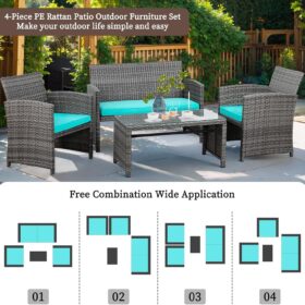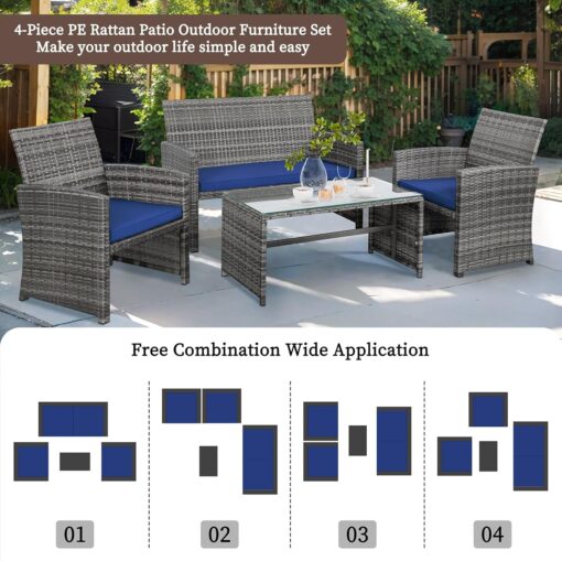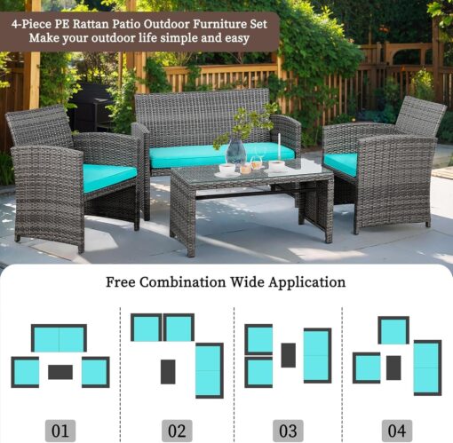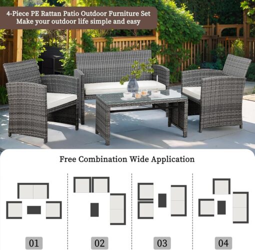 - 【Multiple Combination】This outdoor Sectional furniture set can be easily changed into different combinations for your patio, backyard, poolside, deck, or indoor space. Include 1 x loveseat 2 x single chairs 1 x coffee table with tempered glass tabletop 1 x double cushion 2 x single cushions.