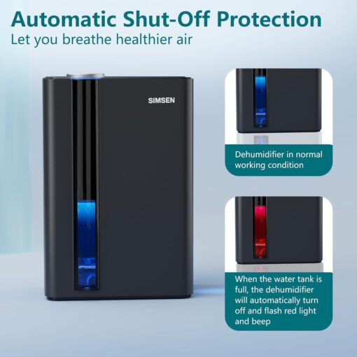 - 【Auto Shut-off�?SIMSEN dehumidifier have auto shut-off feature prevents leaking or overflow when water tank is full. The red indicator flashes to remind you to empty the tank. Its auto-off function makes it be safe to use even when you are not at home. The dehumidifier is also equipped with a drain hose, which allows the dehumidifier to automatically and continuously drain water, eliminating the need to empty the water tank all the time.