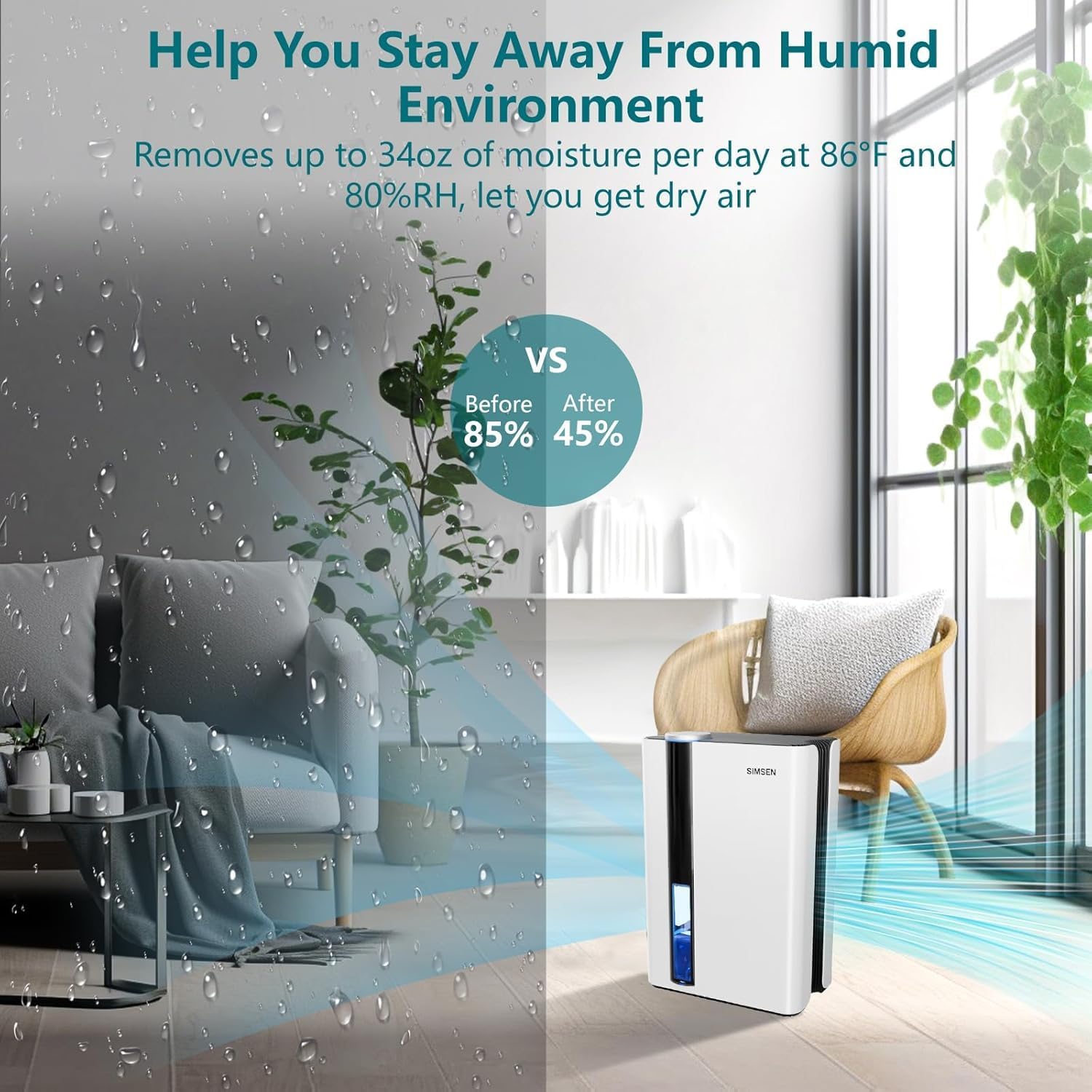 - 【Powerful Dehumidification�?SIMSEN dehumidifier can removes moisture quickly and quietly with advanced semiconductor technology, And equipped 95oz large water tank. the dehumidifiers Maximum dehumidification area up to 800 sq ft. It effectively absorb up to 34oz excess moisture per day (Tested in 86°F, 80% RH), quickly reduce the humidity of the room. You no longer need to endure humid days and enjoy a comfortable living environment.