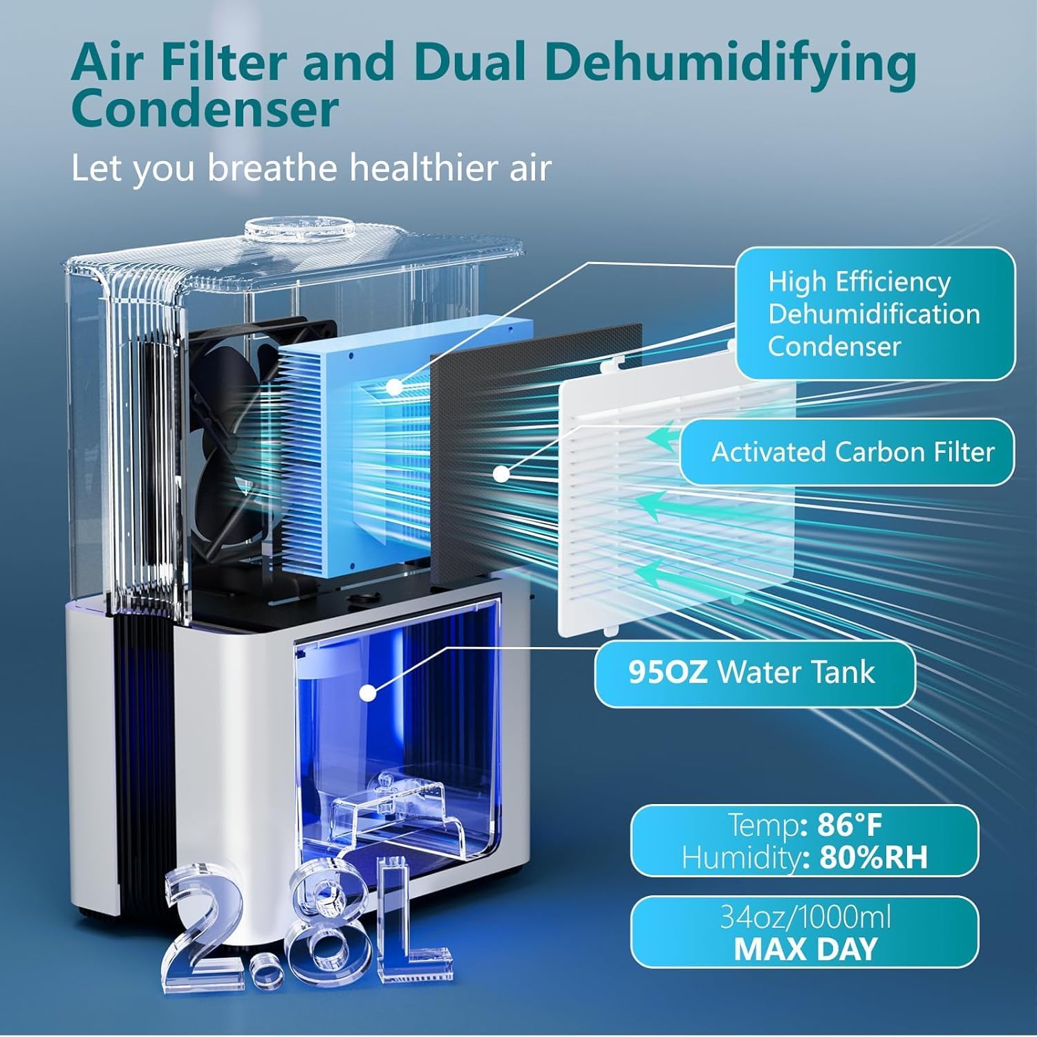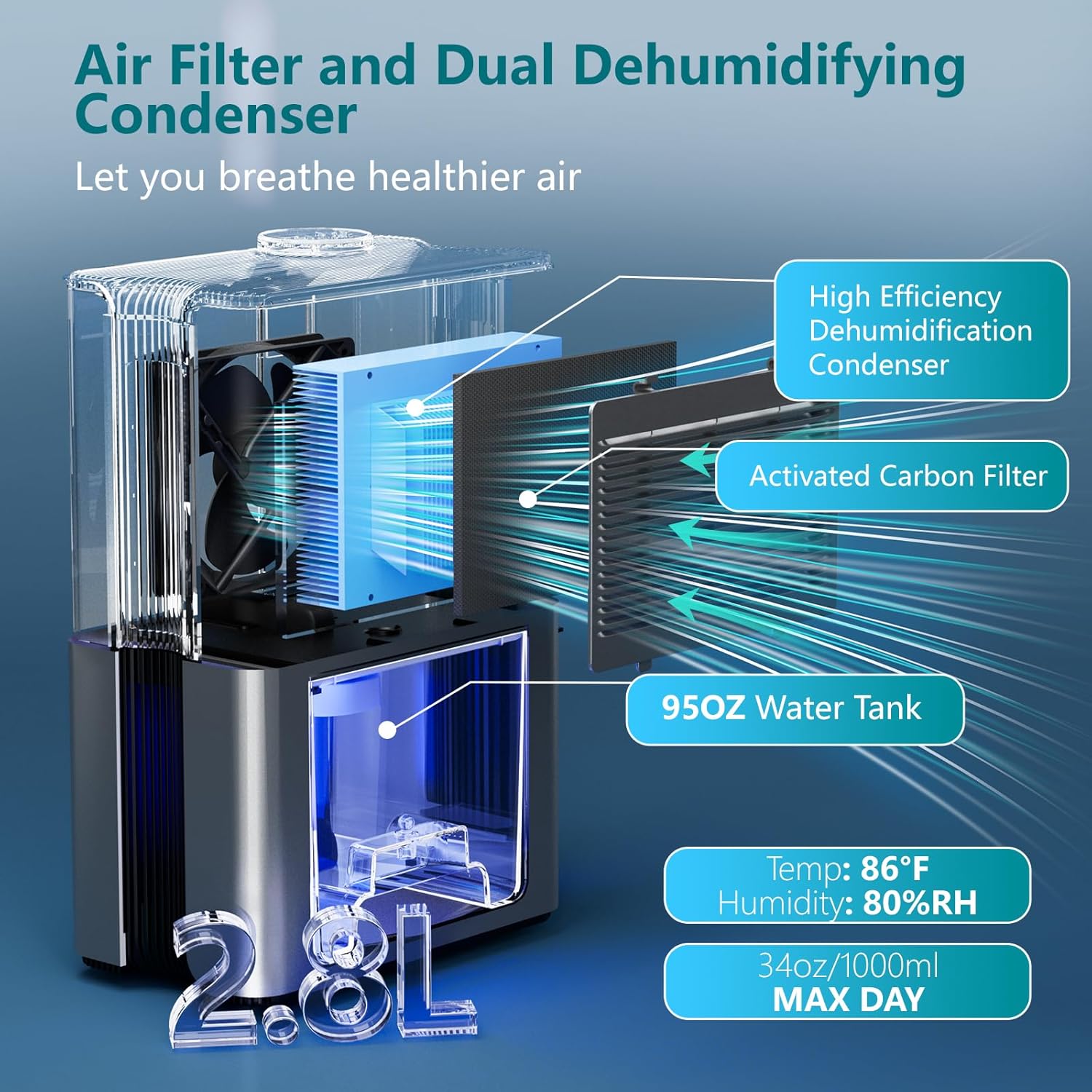 - 【Quiet Sleep & Colorful Atmosphere Light�?Our dehumidifiers for bedroom is designed with 35dB quiet sleep mode and high power mode to meet your various needs, Bass sleep mode lets you sleep and study without any disturbance. And This dehumidifier with auto atmosphere lights create a sweet and romantic night ambiance. You can also choose your favorite color or turn it off.
