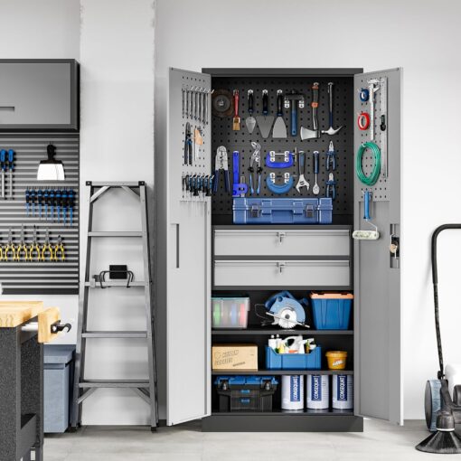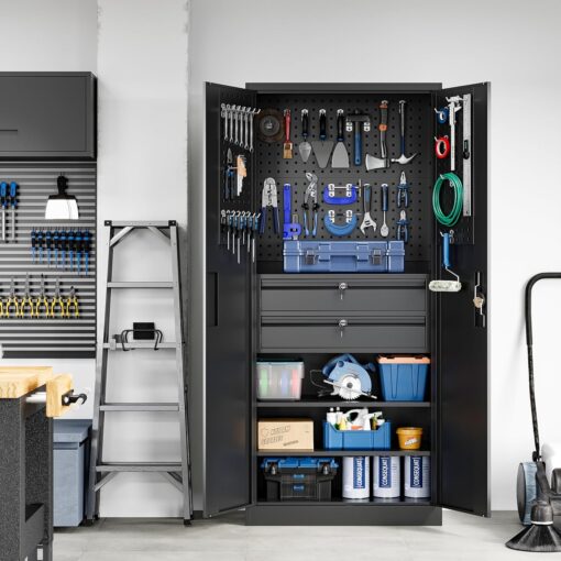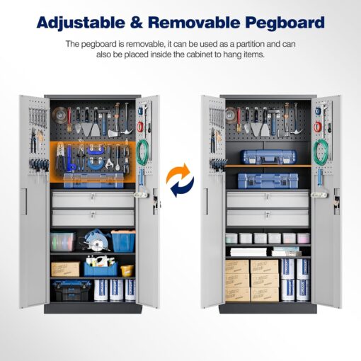 - 『Multifunctional Pegboard』Pegboards inside the heavy duty metal storage cabinet can be used in 3 ways�?. Hang the pegboard inside the cabinet and use the hooks to hang the tools. 2. Use the pegboard as an adjustable shelf to create more layered storage space inside the cabinet. 3. Remove the pegboard and hang it on the wall as a tool hanging board.