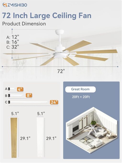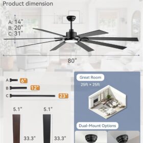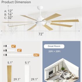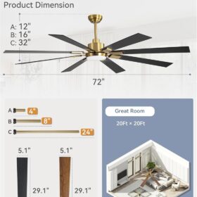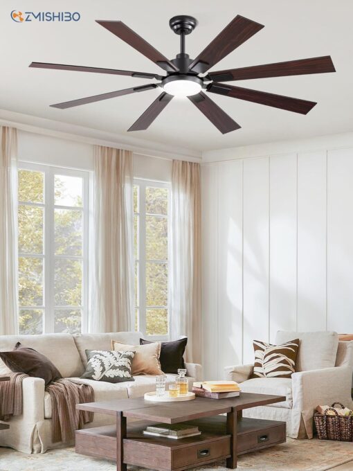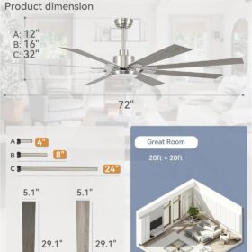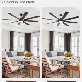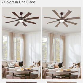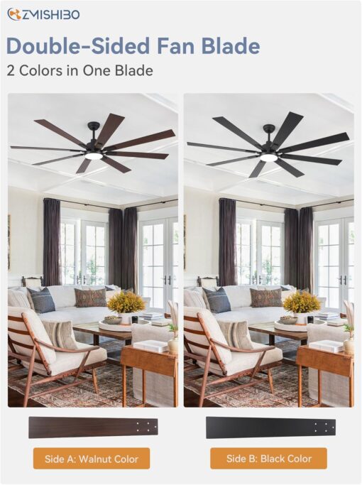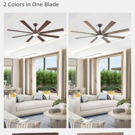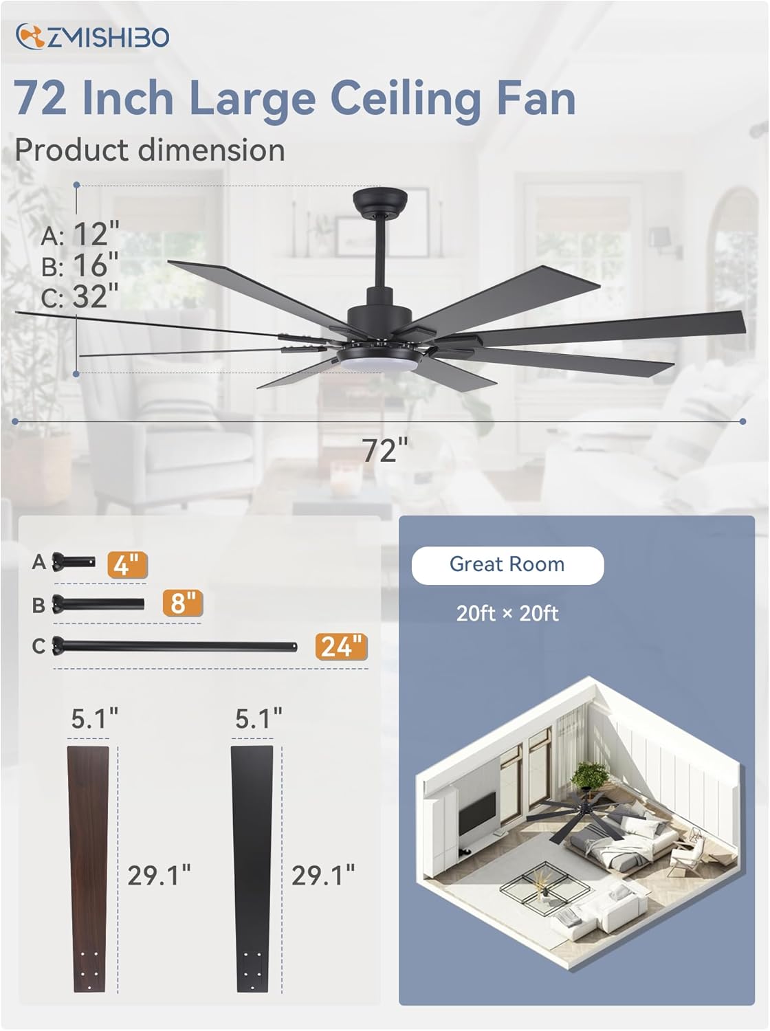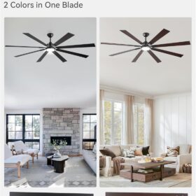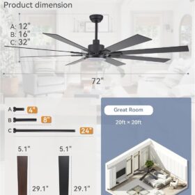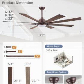 - 72 Inch Ceiling Fan: This large ceiling fan includes 4�? 8�? and 24�?down rods, making it a versatile choice for both low and high ceilings (12-32 inches high). Its stylish fan blades feature a sleek dual-color design in black and walnut, perfectly blending industrial and farmhouse styles. With 8 fan blades, the big ceiling fan offers a cost-effective and eye-catching solution, replacing the need for multiple smaller ceiling fans. Ideal for living room, garage, barn, or covered patio